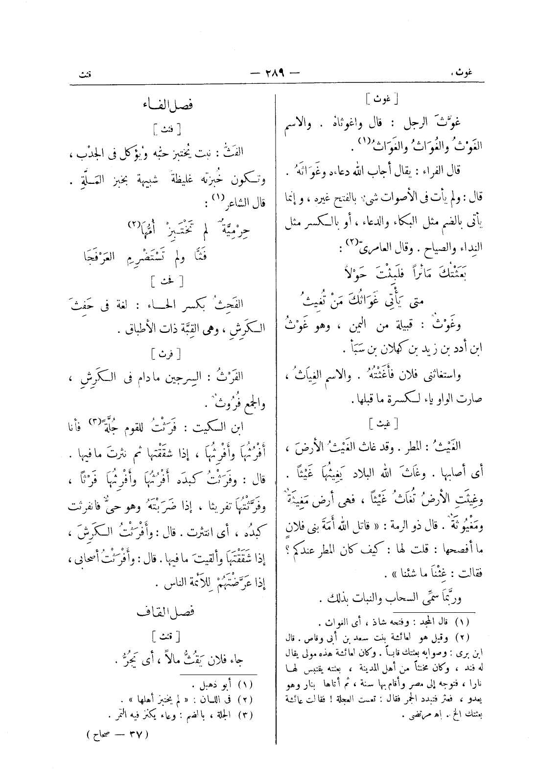 [غوث] غوَّثَ الرجل: قال واغوثاهُ. والاسم الغَوْثُ والغُواثُ والغَواثُ (¬1) . قال الفراء: يقال أجاب الله دعاءه وغواثه. قال: ولم يأت في الاصوات شئ بالفتح غيره، وإنما يأتي بالضم مثل البكاء والدعاء، أو بالكسر مثل النداء والصياح. وقال العامري (¬2) : بعثتك مائرا فلبثت حولا * متى يأتي غواثك من تغيث وغوث: قبيلة من اليمن، وهو غوث ابن أدد بن زيد بن كهلان بن سبأ. واستغاثني فلان فأغَثْتُهُ. والاسم الغِياثُ، صارت الواو ياء لكسرة ما قبلها.