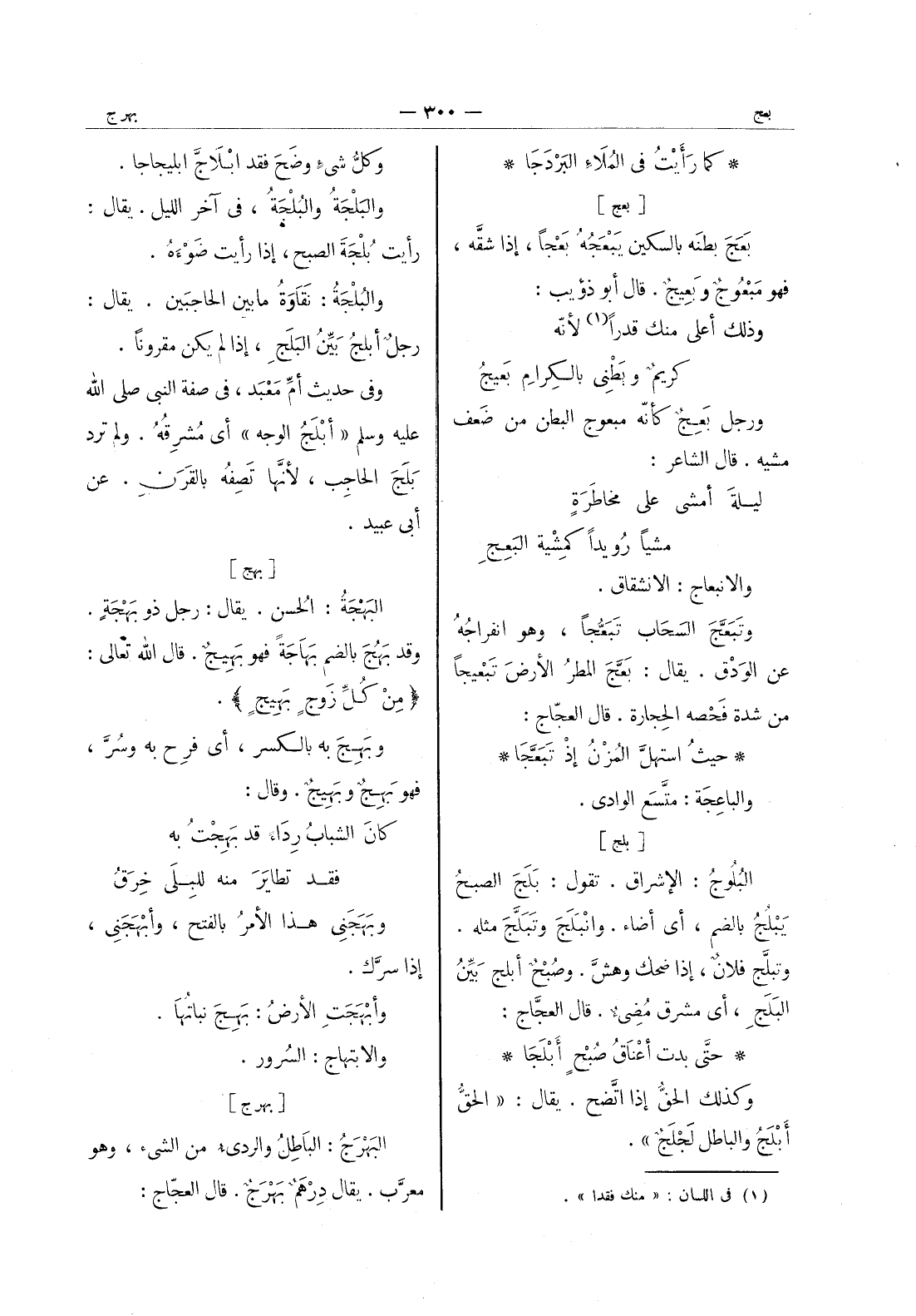 وكل شئ وضح فقد ابْلاَجَّ ابليجاجاً. والبَلْجَةُ والبُلْجَةُ، في آخر الليل. يقال: رأيت بُلْجَةَ الصبح، إذا رأيت ضَوْءَهُ. والبُلْجَةُ: نَقَاوَةُ ما بين الحاجِبَين. يقال: رجلٌ أبلجُ بَيِّنُ البَلَجِ، إذا لم يكن مقرونا. وفى حديث أم معبد، في صفة النبي صلى الله عليه وسلم " أبلج الوجه " أي مشرقه. ولم ترد بلج الحاجب، لانها تصفه بالقرن. عن أبى عبيد.
