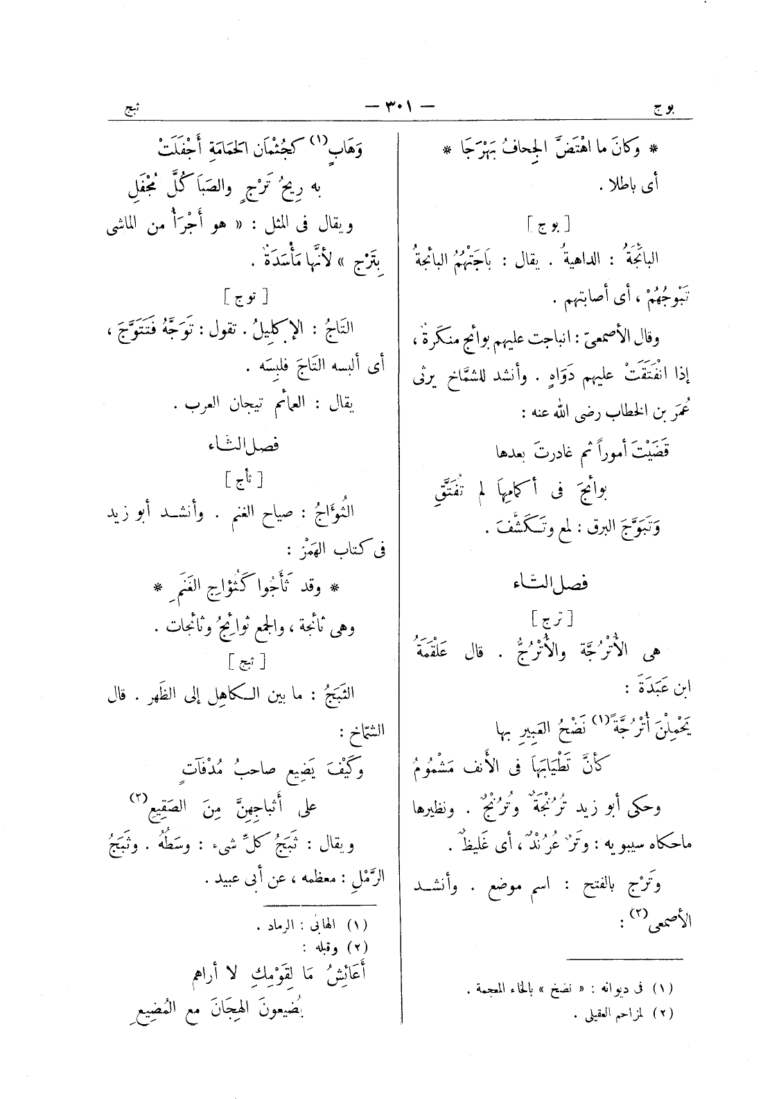 [ترج] هي الاترجة والاترج. قال علقمة ابن عبدة: يحملن أترجة (¬1) نضح العبير بها * كأنَّ تَطْيابَها في الأنف مشموم وحكى أبو زيد ترنجة وترنج، ونظيرها ما حكاه سيبويه: وتر عرند، أي غليظ. وترج بالفتح: اسم موضع. وأنشد الاصمعي (¬2) :