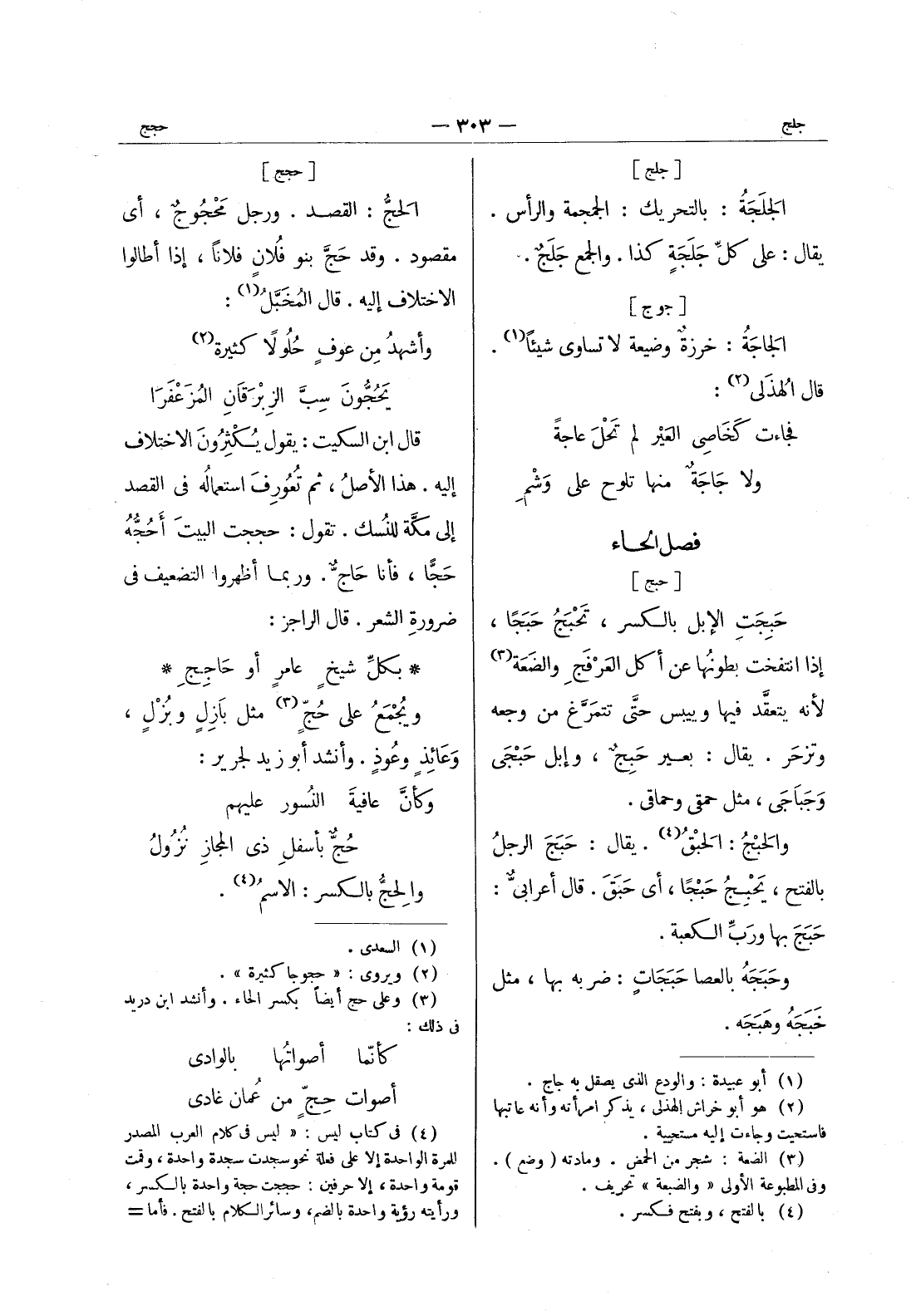 [حجج] الحَجُّ: القصد. ورجل مَحْجوجٌ، أي مقصود. وقد حَجَّ بنو فُلانٍ فلاناً، إذا أطالوا الاختلاف إليه. قال المخبل (¬1) : وأشهد من عوف حلولا كثيرة (¬2) * يحجون سب الزبرقان المزعفرا قال ابن السكيت: يقول يكثرون الاختلاف إليه. هذا الأصلُ، ثم تُعورِفَ استعماله في القصد إلى مكة للنُسك. تقول: حججت البيتَ أحُجُّهُ حجا، فأنا حاج. وربما أظهروا التضعيف في ضرورة الشعر. قال الراجز: