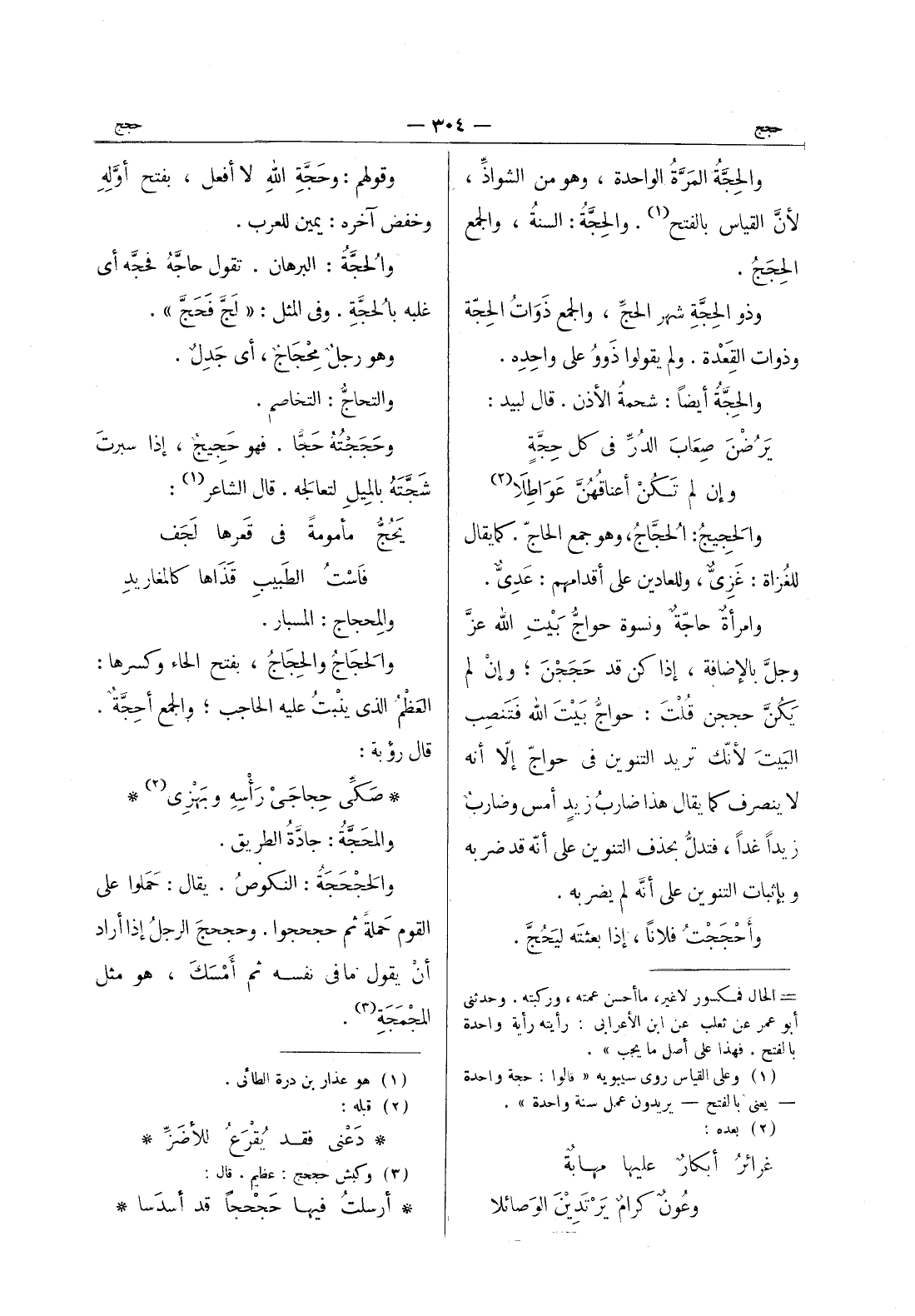 والحجة المَرَّةُ الواحدة، وهو من الشواذ، لأنَّ القياس بالفتح (1) . والحَجَّةُ: السنة، والجمع الحِجَجُ. وذو الحِجَّة شهر الحجِّ، والجمع ذَواتُ الحِجَّةِ وذواتُ القِعْدَةِ. ولم يقولوا ذَوُو على واحِدِهِ. والحِجَّةُ أيضاً: شحمةُ الأذن. قال لبيد: يَرُضْنَ صِعابَ الدُرِّ في كل حِجَّةٍ * وإن لم تَكُنْ أعناقُهُنَّ عَواطِلا (2) والحَجيجُ: الحُجَّاجُ، وهو جمع الحاج، كما يقال للغزاة: غزى، وللعادين على أقدامهم: عدى. وامرأة حاجة ونسوة حواج بيت الله عز وجل بالاضافة، إذا كن قد حججن، وإن لم يكن حججن قلت: حواج بيت الله فتنصب البيت لانك تريد التنوين في حواج إلا أنه لا ينصرف كما يقال هذا ضارب زيد أمس وضارب زيدا غدا، فتدل بحذف التنوين على أنه قد ضربه وبإثبات التنوين على أنه لم يضربه. وأحججت فلانا، إذا بعثته ليحج.