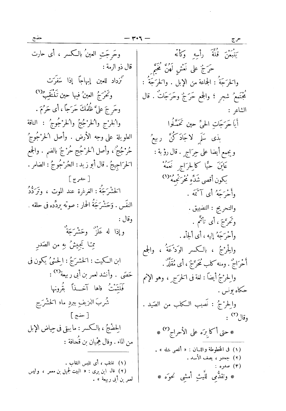 وحرجت العينُ بالكسر، أي حارت قال ذو الرمة: تَزداد للعين إبهاجاً إذا سَفَرَت * وتَحْرَجُ العينُ فيها حين تَنْتَقِبُ (¬1) وحَرِجَ عليَّ ظُلمُكَ حَرَجاً، أي حَرُمَ. والحُرْجُ والحُرْجُجُ والحُرْجوجُ: الناقة الطويلة على وجه الارض. وأصل الحرجوج حرجج، وأصل الحرجج حرج بالضم. والجمع الحراجيج. قال أبو زيد: الحرجوج: الضامر.