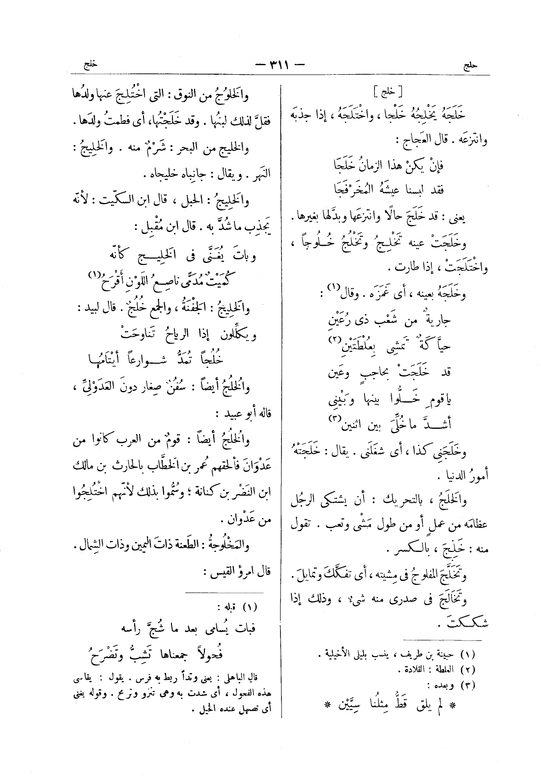 والخَلوجُ من النوق: التي اخْتُلِجَ عنها ولدُها فقلَّ لذلك لبنُها. وقد خَلَجْتُها، أي فطمتُ ولدَها. والخليجُ من البحر: شَرْمٌ منه. والخليجُ: النَهر. ويقال: جانِباه خليجاه. والخَليجُ: الحبل، قال ابن السكّيت: لأنّه يَجذِب ما شُدَّ به. قال ابن مقبل: وبات يغنى في الخليج كأنه * كميت مدمى ناصع اللون أقرح (¬1) والخليج: الجفنة، والجمع خلج. قال لبيد: ويكللون إذا الرياح تناوحت * خلجا تمد شوارعا أيتامها والخُلُجُ أيضاً: سُفُنٌ صِغار دونَ العدولى، قاله أبو عبيد: والخلج أيضا: قوم من العرب كانوا من عدوان فألحقهم عمر بن الخطاب بالحارث بن مالك ابن النضر بن كنانة، وسموا بذلك لانهم اختلجوا من عدوان. والمخلوجة: الطعنة ذات اليمين وذات الشمال. قال امرؤ القيس: