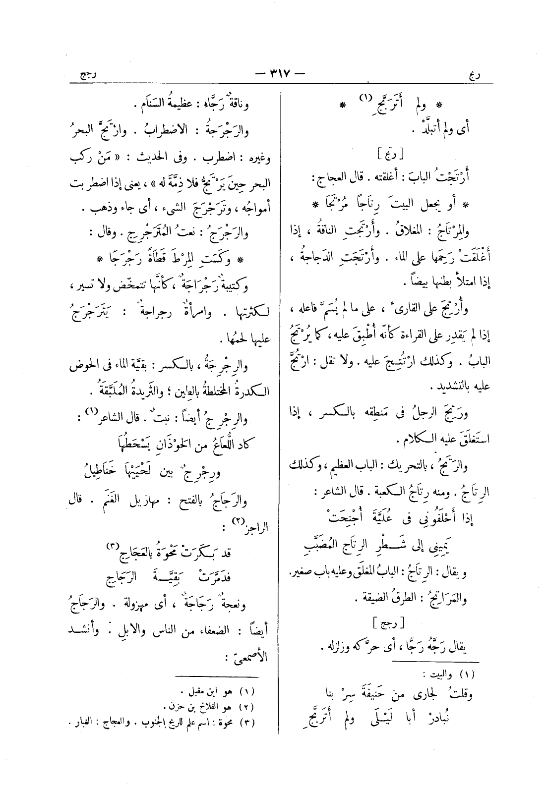 وكَسَتِ المِرْطَ قَطاةً رَجْرَجا * وكتيبةٌ رَجْراجَةٌ، كأنَّها تتمخّض ولا تسير، لكثرتها. وامرأةٌ رجراجةٌ: يَتَرَجْرَجُ عليها لحمُها. والرِجْرِجَةُ، بالكسر: بقيَّة الماء في الحوض الكدرةُ المختلطةُ بالطين، والثَريدةُ المُلَبَّقَةُ. والرِجْرِجُ أيضا: نبت. قال الشاعر (¬1) : كاد اللعاع من الحوذان يسحطها * ورجرج بين لحييها خناطيل والرجاج بالفتح: مهازيل الغنم. قال الراجز (¬2) : قد بكرت محوة بالعجاج (¬3) * فدمرت بقية الرجاج ونعجة رجاجة، أي مهزولة. والرَجاجُ أيضاً: الضعفاء من الناس والابل. وأنشد الاصمعي: