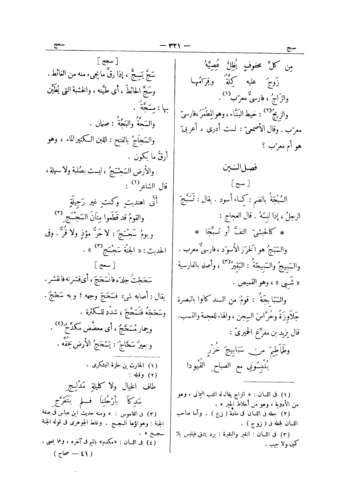 كالحبشي التف أو تسبجا * والسَبَجُ هو الخَرَزُ الأسوَد، فارسيٌّ معرب. والسَبيجُ والسَبيجَةُ: البَقيرُ (¬3) ، وأصله بالفارسية " شبى "، وهو القميص. والسبابجة: قوم من السند كانوا بالبصرة جلاوزة وحراس السجن، والهاء للعجمة والنسب. قال يزيد بن مفرغ الحميرى: وطماطيم من سبابيج خزر * يلبسوني مع الصباح القيودا