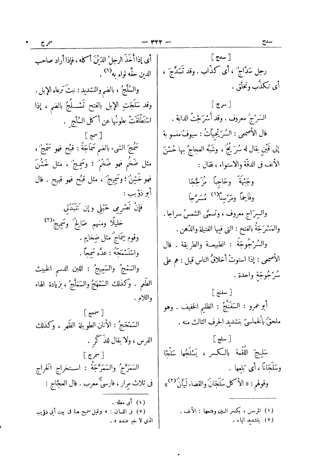 [سرج] السَرْجُ معروف. وقد أَسْرَجْتُ الدابة. قال الاصمعي: السريجيات: سيوف منسوبة إلى قين يقال له سريج، وشبه العجاج بها حسن الانف في الدقة والاستواء، فقال: وجبهة وحاجبا مزججا * وفاحما ومرسنا (¬1) مسرجا والسراج معروف، وتسمى الشمس سراجا. والمسرجة بالفتح: التى فيها الفتيلة والدُهن. والسُرْجوجَةُ: الطبيعة والطريقة. قال الأصمعي: إذا استوتْ أخلاقُ الناس قيل: هم على سُرْجوجَةٍ واحدة.