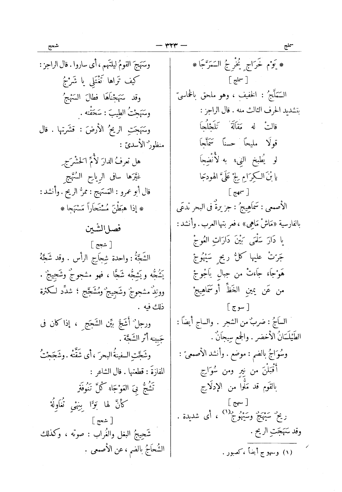 [سملج] السملج: الخفيف، وهو ملحق بالخماسى بتشديد الحرف الثالث منه. قال الراجز: قالت له مقالة تلجلجا * قولا مليحا حسنا سملجا لو يطبخ النئ به لا نضجا يا بن الكرام لج على الهودجا