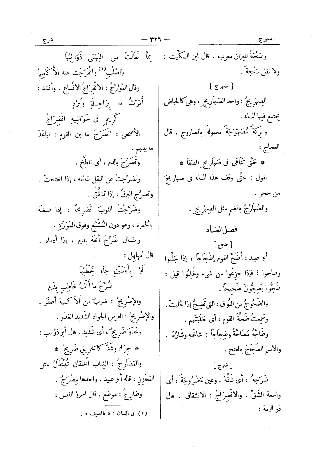 مما تعالت من البهمى ذوائبها * بالصلب (¬1) وانفرجت عنه الاكاميم وقال المؤرج: الانفراج الاتساع. وأنشد: أمرت له براحلة وبرد * كريم في حواشيه انضراج الاصمعي: انضرج ما بين القوم: تباعَدَ ما بينهم. وتَضَرَّجَ بالدم، أي تلطَّخ. وتضرَّجت عن البقل لفائفه، إذا انفتحتْ. وتضرَّج البرقُ، إذا تشقَّق. وضَرَّجْتُ الثوب تَضْريجاً، إذا صبغته بالحُمرة، وهو دون المُشْبَعِ وفوق المُوَرَّدِ. ويقال ضَرَّجَ أنفَه بدمٍ، إذا أدماه. قال مهلهل: لو بأبانين جاء يخطبها * ضرج ما أنف خاطب بدم والإضْريجُ: ضربٌ من الأكسية أصفَر. والإضْريجُ: الفرس الجواد الشَديد العَدْو. وعَدْوٌ ضَريجٌ، أي شديد. قال أبو ذؤيب: