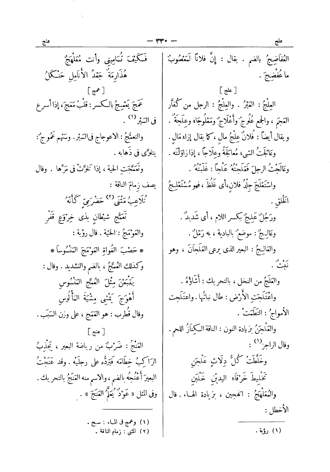 [علج] العِلجُ: العَيْرُ. والعَلْجُ: الرجل من كفَّار العَجَم، والجمع عُلوجٌ وأعلاجٌ ومَعْلوجاءُ وعِلَجَةٌ. ويقال أيضاً: فلانٌ عِلْجُ مالٍ، كما يقال إزاء مال. وعالجت الشئ معالجة وعِلاجاً، إذا زاولته. وعالَجتُ الرجل فَعَلَجْته عَلْجاً: غَلَبْتُهُ. واسْتَعْلجَ جلدُ فلانٍ، أي غلُظ، فهو مُسْتَعْلِجُ الخَلْقِ. ورجل علج بكسر اللام، أي شديد. وعالج: موضع بالبادية، به رمل. والعالج: البعير الذى يرعى العَلَجانَ، وهو نبتٌ. والعَلَجُ من النخل، بالتحريك: أشاؤُهُ. واعْتَلَجَتِ الأرض: طال نباتها. واعتلجَت الأمواجُ: التطمت. والعلجن بزيادة النون: الناقة الكناز اللحم. وقال الراجز (¬1) : وخلطت كل دلاث علجن * تخليط خرقاء اليدين خلبن والمعلهج: الهجين، بزيادة الهاء. قال الاخطل: