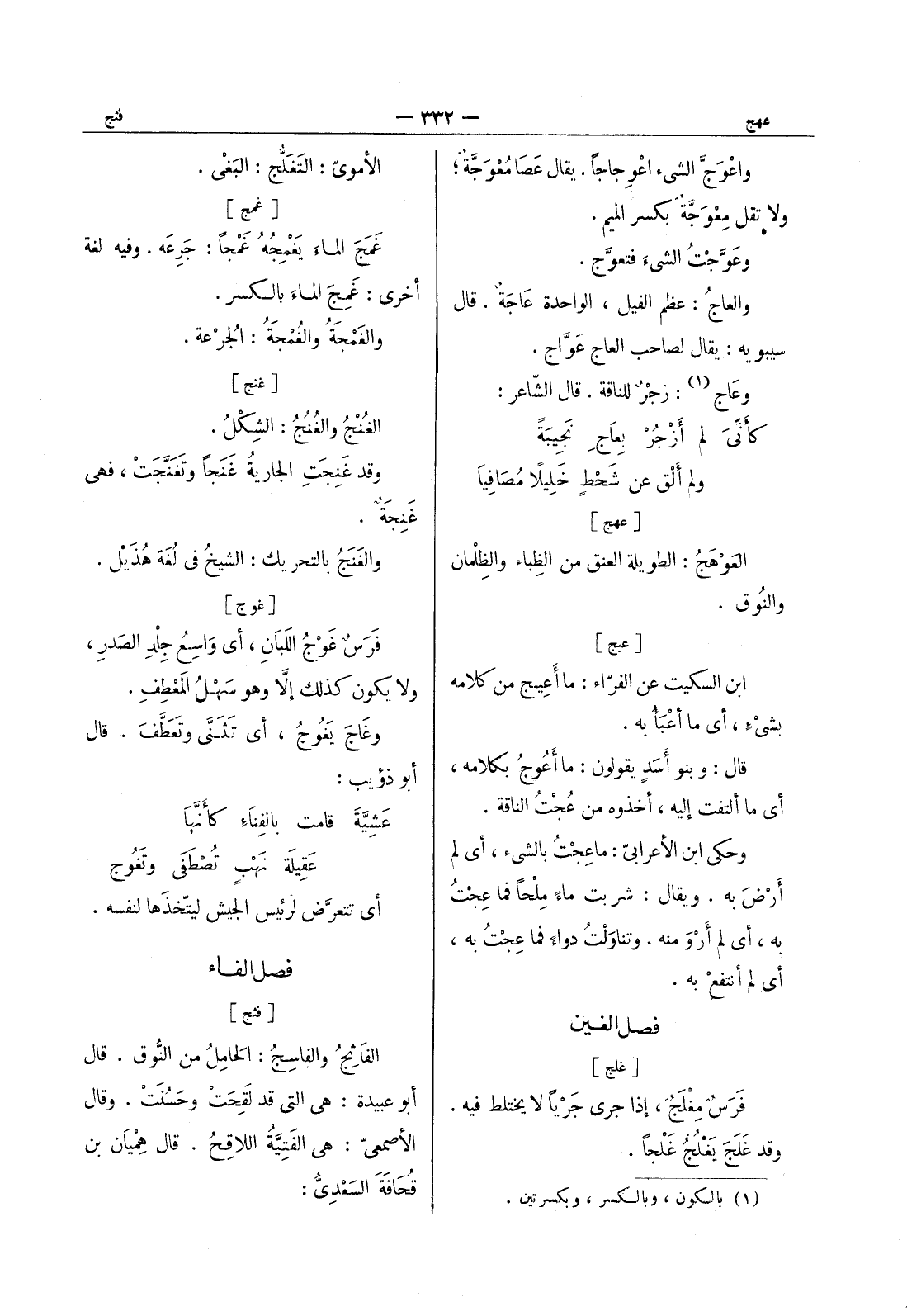 [غوج] فَرسٌ غَوْجُ اللَبانِ، أي واسع جِلْد الصدر، ولا يكون كذلك إلا وهو سهل المَعْطِف. وغاجَ يَغوجُ، أي تَثنَّى وتَعطَّف. قال أبو ذؤيب: عَشِيَّةَ قامت بالفِناءِ كأنَّها * عَقيلَة نَهْبٍ تُصطَفى وتَغوج أي تتعرض لرئيس الجيش ليتخذها لنفسه.