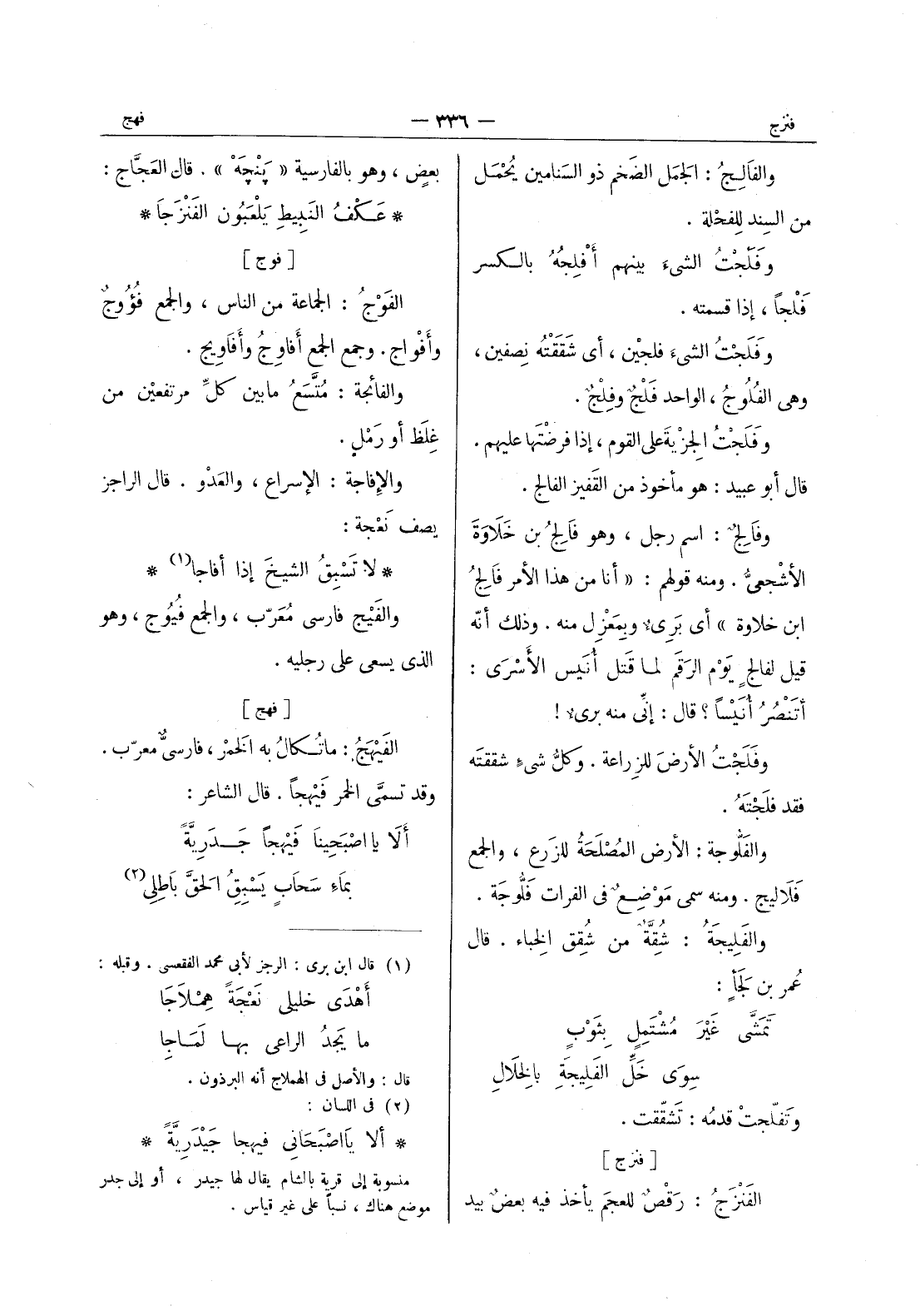 لا تسبق الشيخ إذا إفاجا (¬1) * والفَيْج فارسيّ معرّب، والجمع فُيوج، وهو الذي يسعى على رجليه.