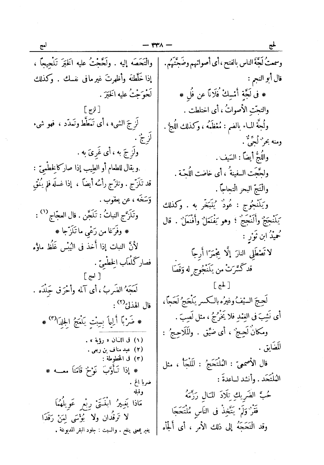 في لجة أمسك فلانا عن فل * والْتَجَّتِ الأصواتُ، أي اختلطت. ولُجَّةُ الماء بالضم: معظمُه، وكذلك اللُجُّ. ومنه بحرٌ لُجِّيٌّ. واللُجُّ أيضاً: السيف. ولَجَّجَتْ السفينةُ، أي خاضت اللجة. والتج البحر التجاجا. ويلنجوج: عود يتبخر به. وكذلك يلنجج وألنجج، وهو يفنعل وأفنعل. قال حميد ابن ثور: لا تصطلي النار إلا مُجْمَراً أَرِجاً قد كَسَّرَتْ من يلنجوج له وقصا