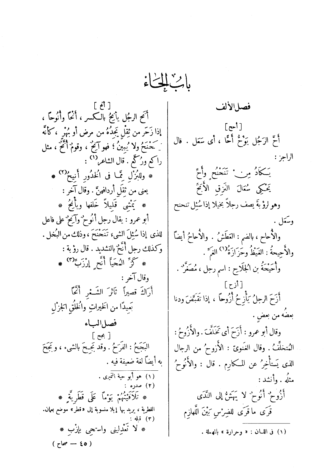 [أحح] أحَّ الرَجُل يَؤُحُّ أحّاً، أي سعل. قال الراجز: يكاد من تنحنح وأح * يحكى سعال النزق الابح وهو لرؤبة يصف رجلا بخيلا إذا سئل تنحنح وسعل. والاحاح، بالضم: العطش. والأُحاحُ أيضاً والأَحيحةُ: الغَيْظُ وحَزازَةُ (¬1) الغم. وأحيحة بن الجلاح: اسم رجل، مصغر.