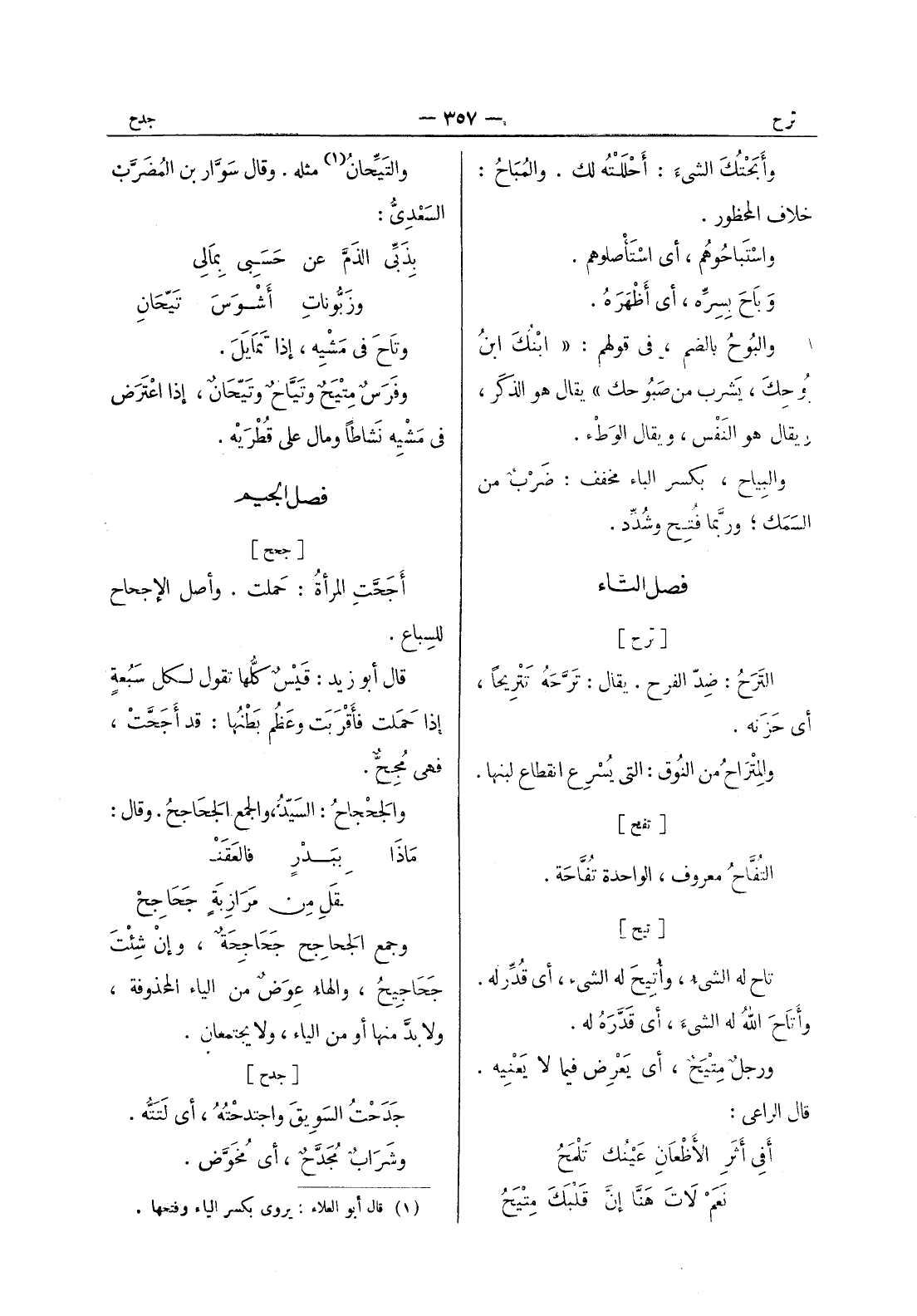 والتيحان (¬1) مثله. وقال سوار بن المضرب السعدى: بذبى الذم عن حسبى بمالى * وزبونات أشوس تيحان وتاح في مَشْيِهِ، إذا تَمايَلَ. وفَرَسٌ مِتْيَحٌ وتَيَّاحٌ وتَيّحانٌ، إذا اعْتَرَض في مِشْيِهِ نَشاطاً ومال على قطريه.