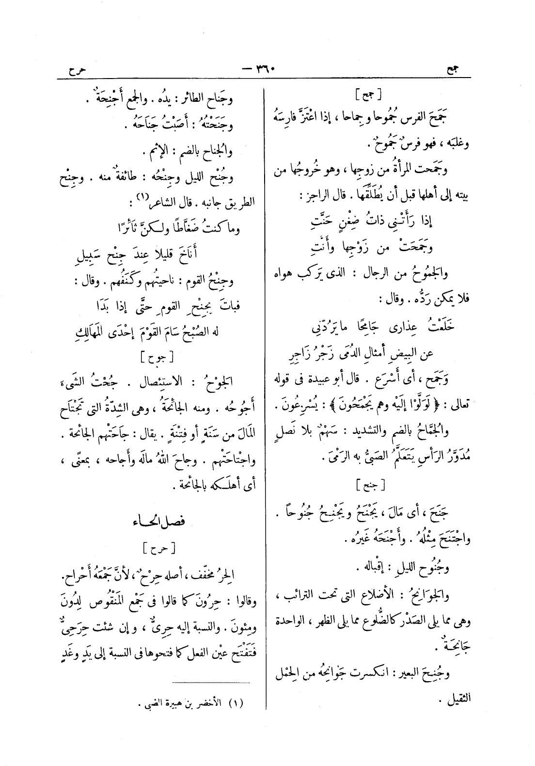وجناح الطائر: يده. والجمع أَجْنِحَةٌ. وجَنَحْتُهُ: أَصَبْتُ جَناحَهُ. والجُناح بالضم: الإثم. وجُنْح الليل وجِنْحُهُ: طائفةٌ منه. وجِنْح الطريق جانبه. قال الشاعر (¬1) : وما كنتُ ضَغَّاطاً ولكنَّ ثائِراً * أَناخَ قليلاً عِندَ جِنْح سَبيلِ وجِنْحُ القوم: ناحيتُهم وكنفهم. وقال: فبات يجنح القوم حتَّى إذا بَدا * له الصُبْحُ سام القوم إحدى المهالك