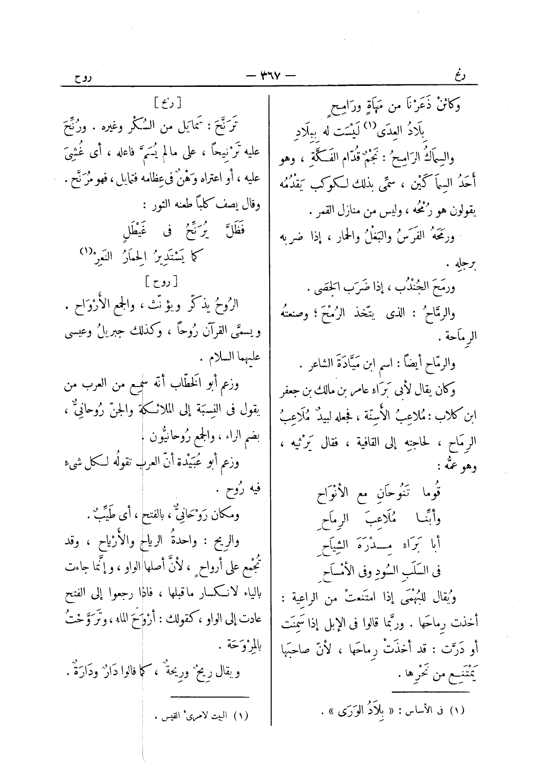 وكائنْ ذَعَرْنا من مَهاةٍ ورامِحِ * بلادُ العِدى (¬1) لَيْسَتْ له بِبِلادِ والسِماكُ الرامِحُ: نَجْمٌ قُدّام الفَكَّةِ، وهو أَحَدُ السِماكَيْن، سمِّي بذلك لكوكب يُقْدُمُه يقولون هو رُمْحُه، وليس من منازل القمر. ورَمَحَهُ الفَرَسُ والبَغْلُ والحمار، إذا ضربه برجلِهِ. ورمَحَ الجُنْدُبُ، إذا ضَرَب الحَصى. والرمَّاحُ: الذي يتّخذ الرُمْحَ، وصنعته الرماحة. والرماح أيضا: اسم ابن ميادة الشاعر. وكان يقال لابي براء عامر بن مالك بن جعفر ابن كلاب: ملاعب الاسنة، فجعله لبيد ملاعب الرماح، لحاجته إلى القافية، فقال يرثيه، وهو عمه: قوما تنوحان مع الانواح * وأبنا ملاعب الرماح أبا براء مدره الشياح * في السُلُبِ السودِ وفي الأَمْساحِ ويقال للبهمى إذا امتَنعت من الراعِية: أخذت رِماحَها. وربَّما قالوا في الإبل إذا سَمِنَت أو دَرَّتْ: قد أخذَتْ رِماحَها، لأنّ صاحبها يَمْتَنِعُ من نحرها.