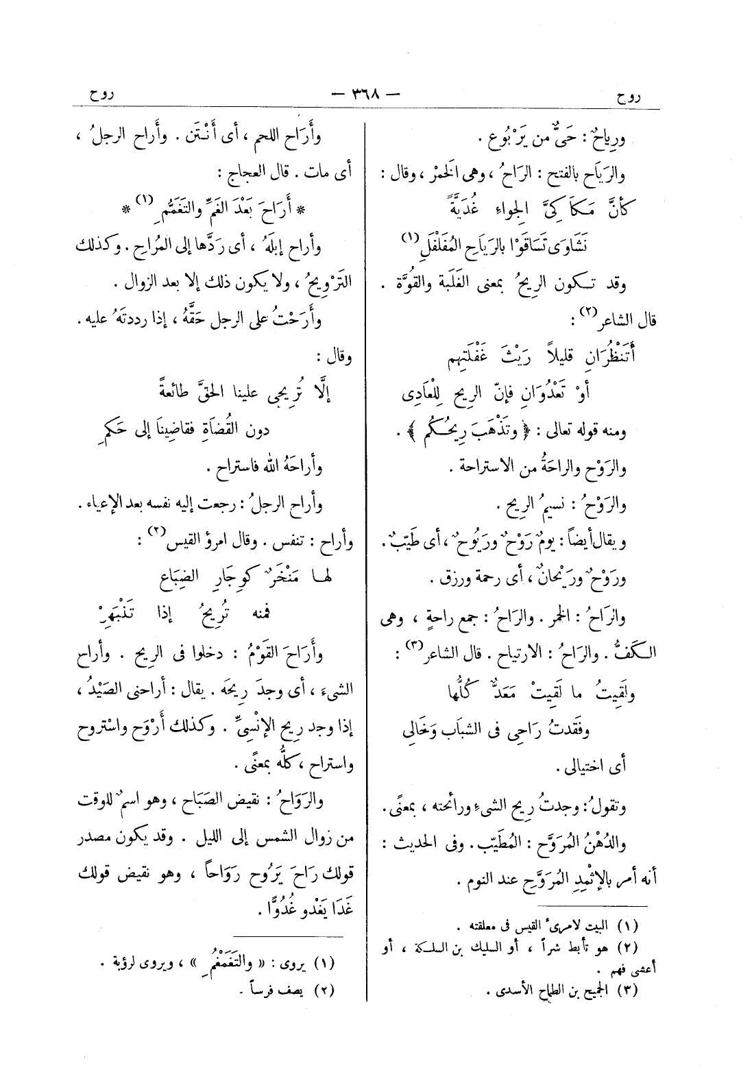 ورياح: حى من يربوع. والرياح بالفتح: الراحُ، وهي الخَمْر، وقال: كأنَّ مَكاكِيَّ الجِواءِ غُدَيَّةً * نَشاوى تَساقَوْا بالرَياحِ المُفَلْفَلِ (¬1) وقد تكون الريحُ بمعنى الغَلَبة والقوَّة. قال الشاعر (¬2) : أَتَنْظُرانِ قليلاً رَيْثَ غَفْلَتِهم * أو تعدو ان فإن الريح للعادي ومنه قوله تعالى: (وتَذْهَبَ ريحُكمْ) . والرَوْحُ والراحَةُ من الاستراحة. والرَوْحُ: نسيمُ الريح. ويقال أيضاً: يومٌ رَوْحٌ ورَيوحٌ، أي طَيِّبٌ. ورَوْحٌ ورَيْحانٌ، أي رحمة ورزق. والراحُ: الخمر. والراحُ: جمع راحةٍ، وهي الكَفُّ. والراحُ: الارتياح. قال الشاعر (¬3) : ولَقيتُ ما لَقيتُ مَعَدٌّ كُلُّها * وفَقدتُ راحي في الشباب وَخالي أي اختيالي. وتقولُ: وجدتُ ريح الشئ ورائحته، بمعنى. والدهن المروح: المُطَيّب. وفي الحديث: أنه أمر بالاثمد المروح عند النوم.