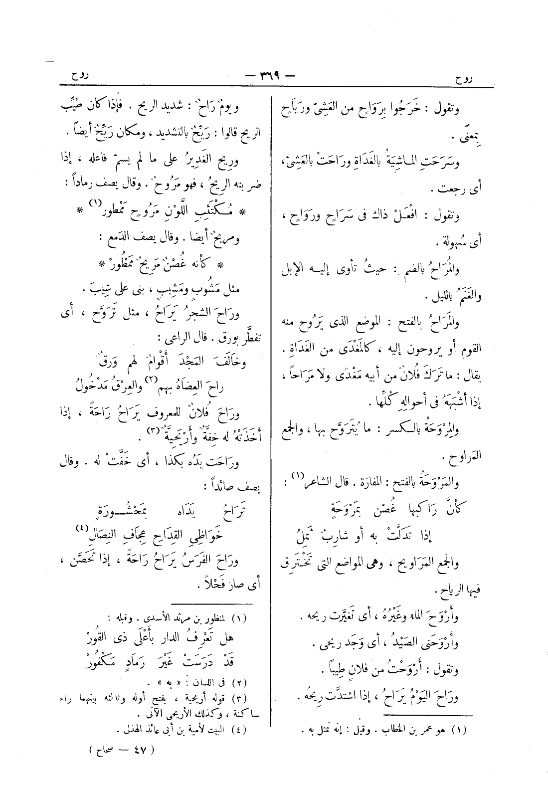 وتقول: خرجوا بِرَواحٍ من العَشِيّ ورَياحٍ بِمعنىً. وسَرَحَتِ الماشِيَةُ بالغَداةِ وراحَتْ بالعَشِيّ، أي رجعت. وتقول: افْعَلْ ذاك في سَراحٍ ورَواحٍ، أي سُهولة. والمُراحُ بالضم: حيثُ تأوي إليه الإبل والغَنَمُ بالليل. والمَراحُ بالفتح: الموضع الذي يَرُوح منه القوم أو يروحون إليه، كالمَغْدَى من الغَداةِ. يقال: ما تَرَكَ فُلانٌ من أبيه مَغْدىً ولا مَراحاً، إذا أَشْبَهَهُ في أحوالِهِ كُلِّها. والمِرْوَحَةُ بالكسر: ما يُتَرَوَّح بها، والجمع المَراوح. والمَرْوَحَةُ بالفتح: المفازة. قال الشاعر (¬1) : كأنَّ راكبها غُصن بمَرْوَحَةٍ * إذا تَدَلَّتْ به أو شارِبٌ ثَمِلُ والجمع المَراويح، وهي المواضع التى تخترق فيها الرياح. وأَرْوَحَ الماء وغَيْرُهُ، أي تَغيَّرت ريحه. وأَرْوَحَني الصَيْدُ، أي وَجَد ريحي. وتقول: أَرْوَحْتُ من فلانِ طيباً. وراحَ اليَوْمُ يَراحُ، إذا اشتدت ريحه.