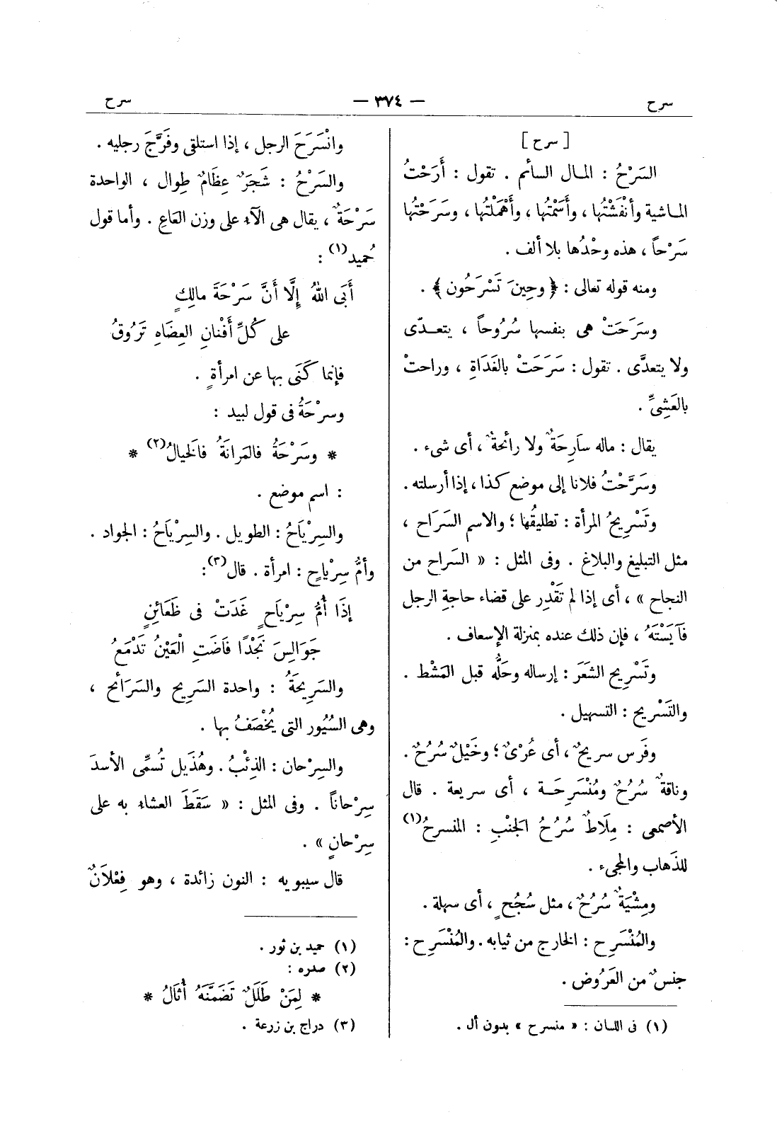 وانْسَرَحَ الرجل، إذا استلقى وفَرَّجَ رجليه. والسَرْحُ: شَجَرٌ عِظامٌ طِوال، الواحدة سَرْحَةٌ، يقال هي الآءُ على وزن العاع. وأما قول حُميد (¬1) : أَبى اللهُ إلاَّ أَنَّ سَرْحَةَ مالِكٍ * على كُلِّ أَفْنانِ العِضاهِ تَروقُ فإنما كنى بها عن امرأة. وسرحة في قول لبيد: