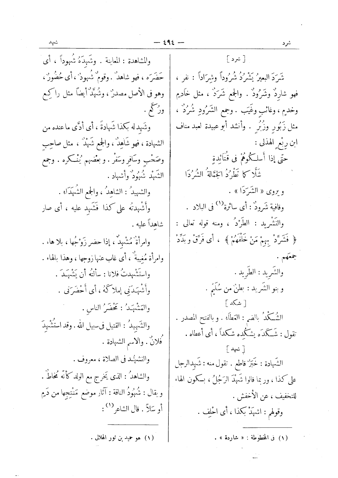 والمشاهدة: المعاينة. وشهده شُهوداً: أي حَضَرَه، فهو شاهدٌ. وقومٌ شُهودٌ، أي حُضورٌ، وهو في الأصل مصدرٌ، وشُهَّدٌ أيضاً مثل راكع وركع. وشَهِد له بكذا شَهادةً، أي أدَّى ما عنده من الشهادة، فهو شاهد، والجمع شهد، مثل صاحب وصحب وسافر وسفر. وبعضهم ينكره. وجمع الشهد شهودا وأشهاد. والشهيد: الشاهد، والجمع الشُهَداءُ. وأَشْهَدْتُهُ على كذا فَشَهِدَ عليه، أي صار شاهِداً عليه. وامرأةٌ مُشْهِدٌ، إذا حضر زَوْجُها، بلا هاء. وامرأة مُغيبةٌ، أي غاب عنها زوجها، وهذا بالهاء. واسْتَشْهَدْتُ فلاناً: سألْتُه أن يشْهَدَ. وأَشْهَدَني إملاكَهُ، أي أَحْضَرَني. والمَشْهَدُ: مَحْضَرُ الناسِ. والشَهيدُ: القتيل في سبيل الله. وقد استُشْهِدَ فُلانٌ. والاسم الشهادة. والتشهُّد في الصلاة، معروف. والشاهدُ: الذي يَخرج مع الولد كأنه مخالط. ويقال: شُهودُ الناقة: آثار موضع مَنْتِجِها من دِمٍ أو سَلاً. قال الشاعر (¬1) :