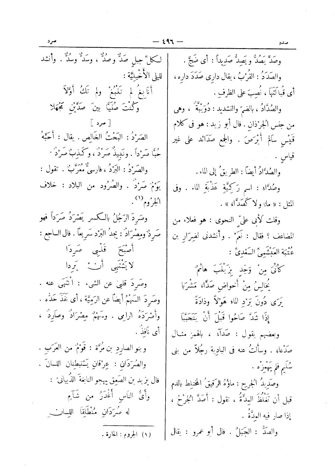 [صرد] الصَرْدُ: البَحْتُ الخالِص. يقال: أحبه حبا صردا. ونبيذ صرد، وكَذِبٌ صَرْدٌ. والصَرْدُ: البَرْدُ، فارسيٌّ مُعَرَّبٌ. تقول: يَوْمٌ صَرْدٌ. والصُرود من البلاد: خلاف الجُروم (¬1) . وصَرِدَ الرَجُلُ بالكسر يَصْرَدُ صَرَداً فهو صَرِدٌ ومِصْرادٌ: يجدُ البَرْد سَريعاً. قال الساجع: أصبح قلبى صردا * لا يشتهى أن يردا - وصرد قلبى عن الشئ: انتهى عنه. وصَرِدَ السَهْمُ أيضاً عن الرَمِيَّة، أي نَفَذَ حَدُّه. وأَصْرَدَهُ الرامي. وسَهْمٌ مِصْرادٌ وصارِدٌ، أي نافذ. وبنو الصارد بن مرة: قوم من العرب. والصردان: عرقان يستبطنان اللسان. قال يزيد بن الصَعِق يهجو النابغةَ الذُبيانيّ: وأيُّ الناسِ أَغْدَرُ من شَآمٍ * له صُرَدانِ مُنْطَلِقا اللسان -