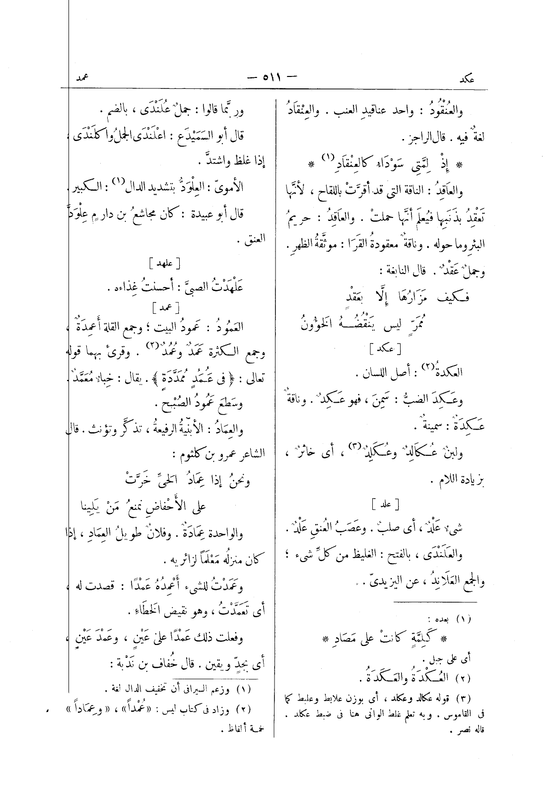 [عمد] العَمودُ: عَمودُ البيت، وجمع القلَّة أعمِدَةٌ، وجمع الكثرة عَمَدٌ وعمدٌ (¬2) . وقرئ بهما قوله تعالى: