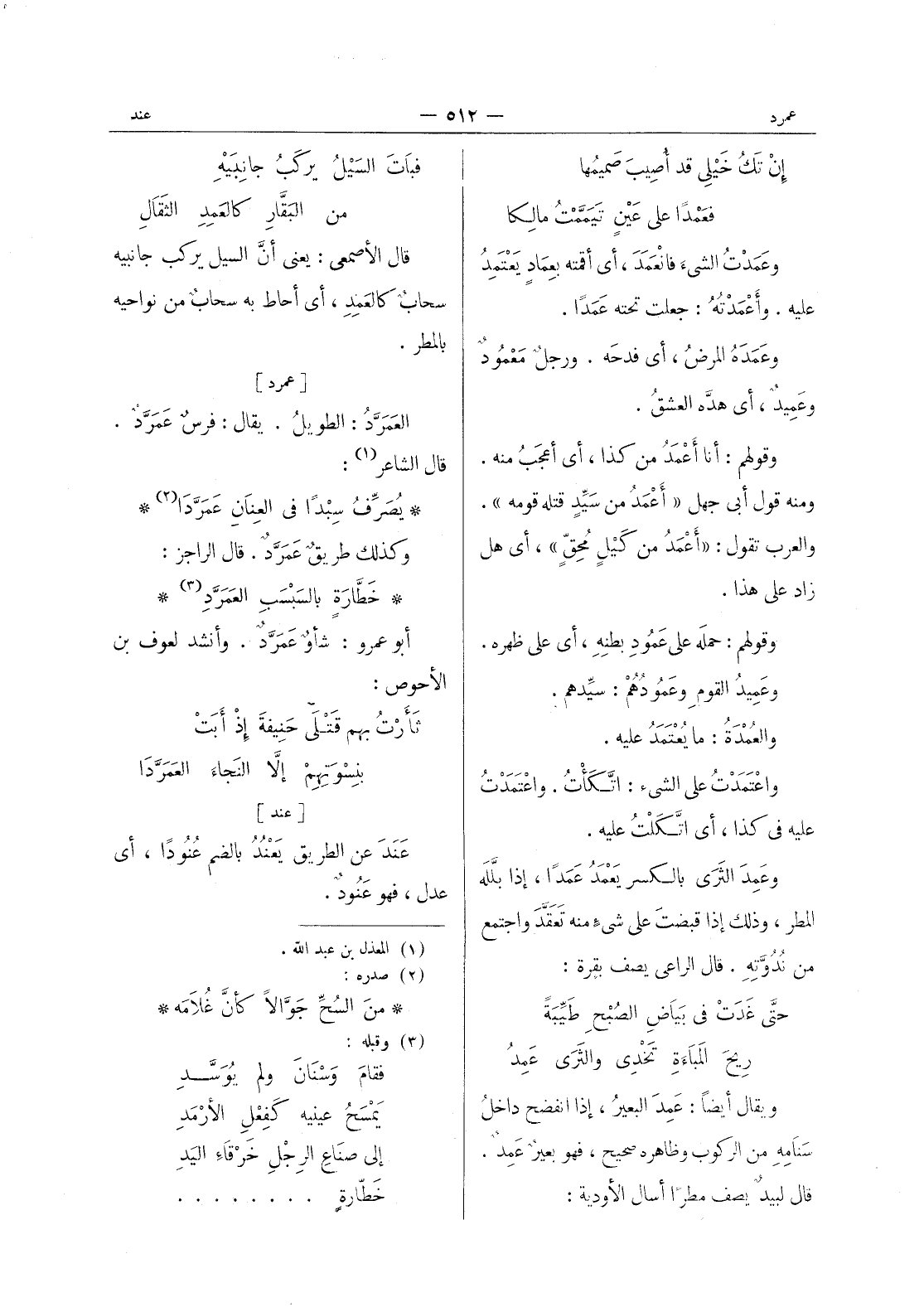 إن تكُ خيْلي قد أصيبَ صَميمُها * فعَمْداً على عينٍ تيمَّمْتُ مالِكا - وعمدت الشئ فانعمد، أي أقمته بعِمادٍ يَعْتَمِد عليه. وأعْمَدْتُهُ: جعلت تحته عمدا. وعمد المرض، أي فدحَه. ورجلٌ مَعْمودٌ وعَميدٌ، أي هدَّه العشق. وقولهم: أنا أعْمَدُ من كذا، أي أعجب منه. ومنه قول أبي جهل " أعْمَدُ من سيِّدٍ قتله قومه ". والعرب تقول: " أعْمَدُ من كيْلٍ مُحِقٍّ "، أي هل زاد على هذا. وقولهم: حملَه على عَمودِ بطنِهِ، أي على ظهره. وعَميدُ القومِ وعَمودُهُمْ: سيِّدهم. والعُمْدَةُ: ما يُعتمد عليه. واعتمد على الشئ: اتكأت. واعْتَمَدْتُ عليه في كذا، أي اتكلت عليه. وعمد الثرى بالكسر يعْمَدُ عَمَداً، إذا بلَّلَهُ المطر، وذلك إذا قبضت على شئ منه تعَقَّدَ واجتمع من نُدُوَّتِهِ. قال الراعي يصف بقرة: حتَّى غَدت في بياضِ الصُبْحِ طيَّبَةً * ريح المباءة تخدى والثرى عمد - ويقال أيضاً: عَمِدَ البعيرُ: إذا انفضح داخل سنامه من الركوب وظاهره صحيح: فهو بعيرٌ عَمِدٌ. قال لبيد يصف مطر أسال الاودية: