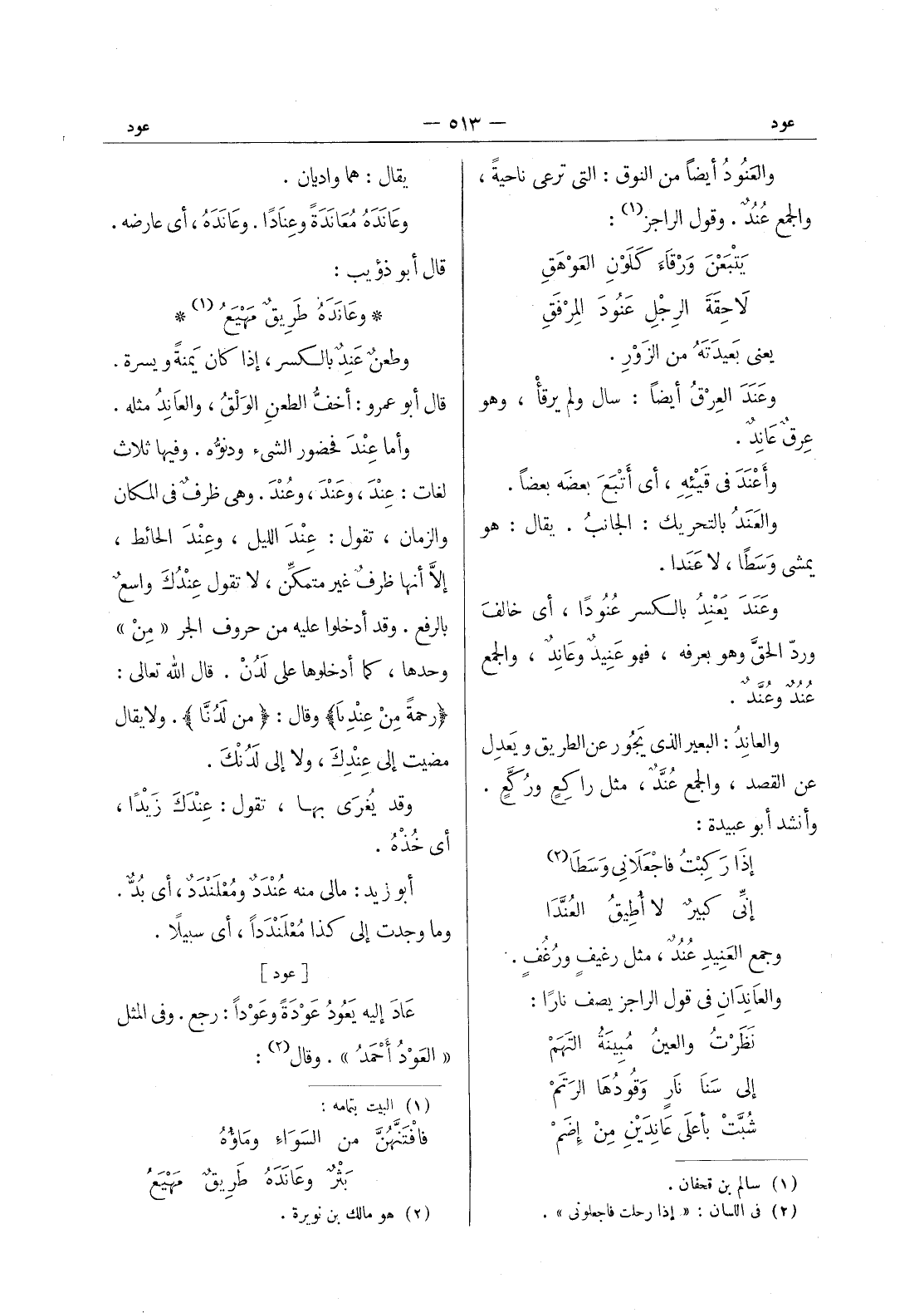 والعنود أيضا من النوق: التى تزعى ناحية، والجمع عند. وقول الراجز (¬1) : يتبعن ورقاء كلون العوهق * لاحقة الرجل عنود المرفق - يعنى بعيدته من الزور. وعَنَدَ العرقُ أيضاً: سال ولم يرقأ، وهو عرق عاند. وأعندى في قيئِهِ، أي اتَّبع بعضه بعضاً. والعَنَدُ بالتحريك: الجانبُ. يقال: هو يمشي وَسَطاً، لا عَنَدا. وعَنَدَ يَعْنِدُ بالكسر عُنُوداً، أي خالف ورد الحق وهو بعرفه، فهو عَنيدٌ وعانِدٌ، والجمع عُنُدٌ وعُنَّدٌ. والعانِدُ: البعير الذي يجور عن الطريق ويعدِل عن القصد، والجمع عند، مثل راكع وركع. وأنشد أبو عبيدة: إذا ركبت فاجعلانى وسطا (¬2) * إنى كبير لا أطيق العندا - وجمع العنيد عند، مثل رغيف ورغف. والعاندان في قول الراجز يصف نارا: نظرت والعين مبينة التهم * إلى سنا نار وقودها الرتم * شبت بأعلى عاندين من إضم