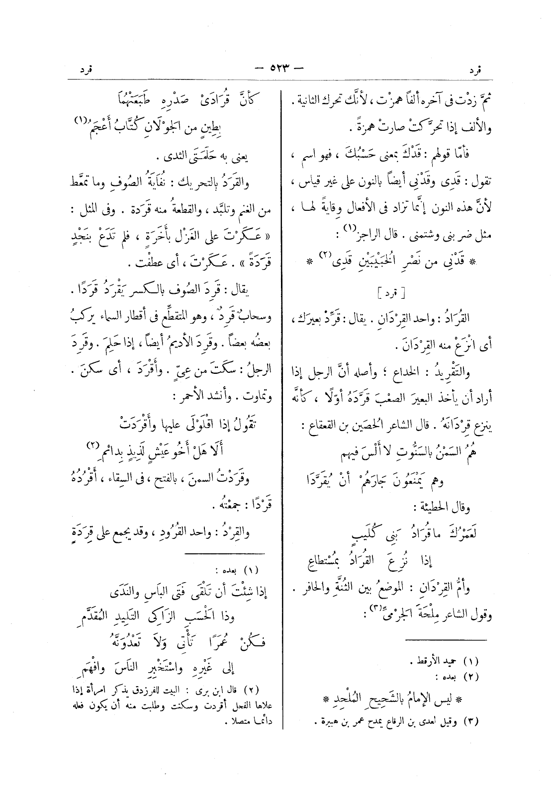 كأن قرادى صدره طبعتهما * بطين من الجولان كتاب أعجم (¬1) - يعنى به حلمتي الثدى. والقرد بالتحريك: نُفايةُ الصوف وما تمعَّط من الغنم وتلبَّد، والقطعة منه قردة. وفى المثل: " عكرت على الغزل بأخرة، فلم تدع بنجد قردة ". عكرت، أي عطفت. يقال: قرد الصوف بالكسر يَقرَدُ قَرَداً. وسحابٌ قَرِدٌ، وهو المتقطِّع في أقطار السماء يركب بعضه بعضاً. وقَرِدَ الأديمُ أيضاً، إذا حَلِمَ. وقَرِدَ الرجلُ: سكتَ من عِيٍّ. وأقْرَدَ، أي سكنَ. وتماوت. وأنشد الأحمر: تقولُ إذا اقْلَوْلى عليها وأقْرَدَتْ * ألا هل أخو عَيْشٍ لَذيذٍ بِدائمِ (¬2) - وقَرَدْتُ السمن، بالفتح، في السقاء، وأقرده قردا: جمعته. والقرد: واحدة القرود، وقد يجمع على قرده