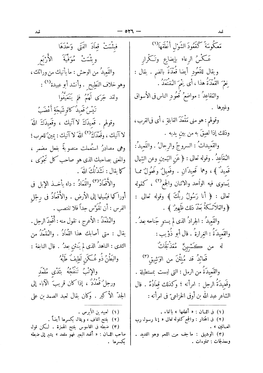 (والملائكة بعد ذلك ظهير) *. والقعيد: الجراد الذى لم يستوِ جناحه بعد. والقَعيدَةُ: الغِرارَةُ. قال أبو ذؤيب: له من كسبهن معذلجات * قعائد قد ملئن من الوشيق (¬3) - والقَعيدَةُ من الرمل: التي ليست بمستطيلة. وقَعيدَةُ الرجل: امرأته، وكذلك قعاده. قال الشاعر عبد الله بن أوفى الخزاعى في امرأته.