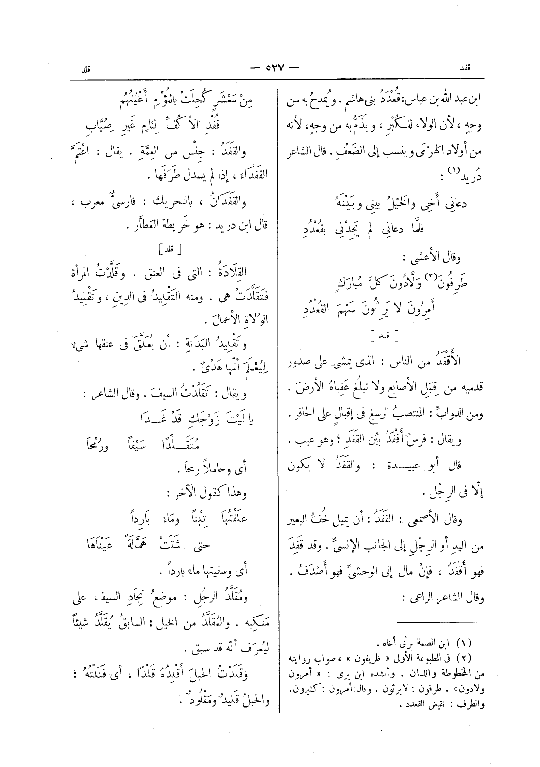 ابن عبد الله بن عباس: قعدد بنى هاشم. ويمدح به من وجه، لان الولاء للكبر، ويذم به من وجه، لانه من أولاد الهرمى وينسب إلى الضعف. قال الشاعر دريد (¬1) : دعاني أخى والخيل بينى وبينه * فلما دعاني لم يجدنى بقعدد - وقال الاعشى: طرفون (¬2) ولادون كل مبارك * أَمِرونَ لا يَرِثونَ سَهْمَ القُعْدُدِ -