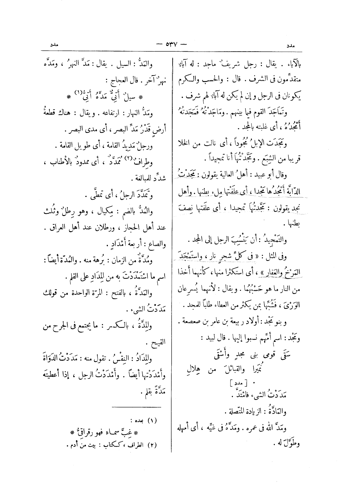 سيلٌ أتيٌّ مده أتى (¬1) * مد النهار: ارتفاعه. ويقال: هناك قطعةُ أرضٍ قَدْرُ مَدِّ البصر، أي مدى البصر. ورجلٌ مَديدُ القامة، أي طويل القامة. وطِرافٌ (¬2) مُمَدَّدٌ، أي ممدودٌ بالأطناب، شدد للمبالغة. وتَمَدَّدَ الرجلُ، أي تمطَّى. والمُدُّ بالضم: مِكيال، وهو رِطلٌ وثُلث عند أهل الحجاز، ورطلان عند أهل العراق. والصاع: أربعة أمْدادٍ. ومُدَّةٌ من الزمان: بُرهة منه. والمُدّة أيضاً: اسم ما اسْتَمْدَدْتَ به من المِدادِ على القلم. والمَدَّةُ، بالفتح: المرّة الواحدة من قولك مَدَدْتُ الشئ. والمدة، بالكسر: ما يجتمع في الجرح من القيح. والمِدادُ: النِقْسُ. تقول منه: مَدَدْتُ الدَواة وأمْدَدْتها أيضاً. وأمْدَدْتُ الرجل، إذا أعطيته مدة بقلم.