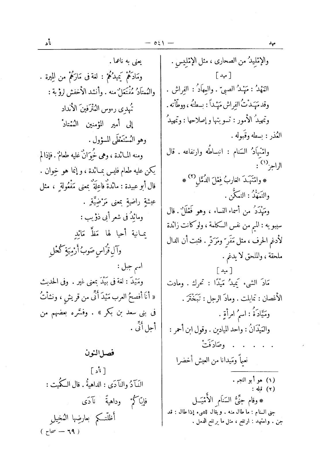 يعنى به ناعما. ومادَهُمْ يَميدُهُمْ: لغة في مارَهُمْ من المِيرة. والمُمتادُ مُفْتَعَلٌ منه. وأنشد الأخفش لرؤبة: تُهدي رءوس المُتْرَفينَ الأندادْ * إلى أمير المؤمنين المُمْتادْ - وهو المُسْتعطى المسؤول. ومنه المائدة، وهى خوان غليه طعام. فإذا لم يكن عليه طعام فليس بمائدة، وإنَّما هو خِوان. قال أبو عبيدة: مائدة فاعلة بمعنى مفعولة، مثل عيشة راضية بمعنى مرضية. ومائد في شعر أبى ذؤيب: يمانية أحيا لها مظ مائد * وآل قراس صوب أرمية كحل - اسم جبل: ومَيْدَ: لغة في بَيْدَ بمعنى غير. وفي الحديث " أنا أفصحُ العرب مَيْدَ أنِّي من قريشٍ، ونشأتُ في بني سعد بن بكر ". وفسَّره بعضهم من أجل أنى.
