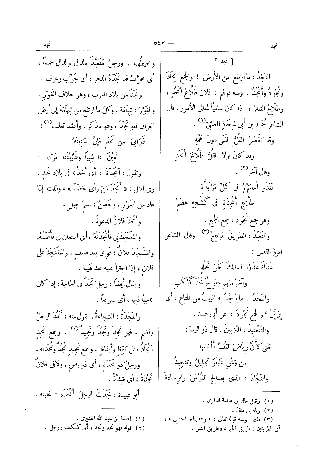 [نجد] النَجْدُ: ما ارتفع من الأرض، والجمع نِجادٌ ونُجودٌ وأنْجُدٌ. ومنه قولهم: فلان طَلاَّعُ أنْجُدٍ، وطلاّع الثنايا، إذا كان سامياً لمعالي الأمور. قال الشاعر حميد بن أبي شِحاذِ الضّبّي (¬1) . وقد يَقْصُرُ القُلُّ الفَتى دون هَمِّهِ * وقد كان لولا القل طَلاّعَ أنْجُدِ - وقال آخر (¬2) : يَغدو أمامَهُمُ في كلِّ مَرْبأةٍ * طلاّعِ أنْجِدَةٍ في كَشْحِهِ هضَمُ - وهو جمع نُجود، جمع الجمع. والنَجْدُ: الطريق المرتفع (¬3) . وقال الشاعر امرؤ القيس: غَداةَ غَدَوْا فسالِكٌ بَطْنَ نَخْلةٍ * وآخرُ منهم جازِعٌ نَجْدَ كَبْكَبِ - والنَجْدُ: ما يُنجَّدُ به البيتُ من المتاع، أي يزيَّنُ، والجمع نجود، عن أبى عبيد. والتنجيد: التزيين قال ذو الرمّة: حتَّى كأنَّ رِياضَ القُفِّ ألْبَسَها * من وَشي عَبْقَرَ تجليلٌ وتنجيدُ - والنَجَّادُ: الذي يعالج الفرش والوسادة