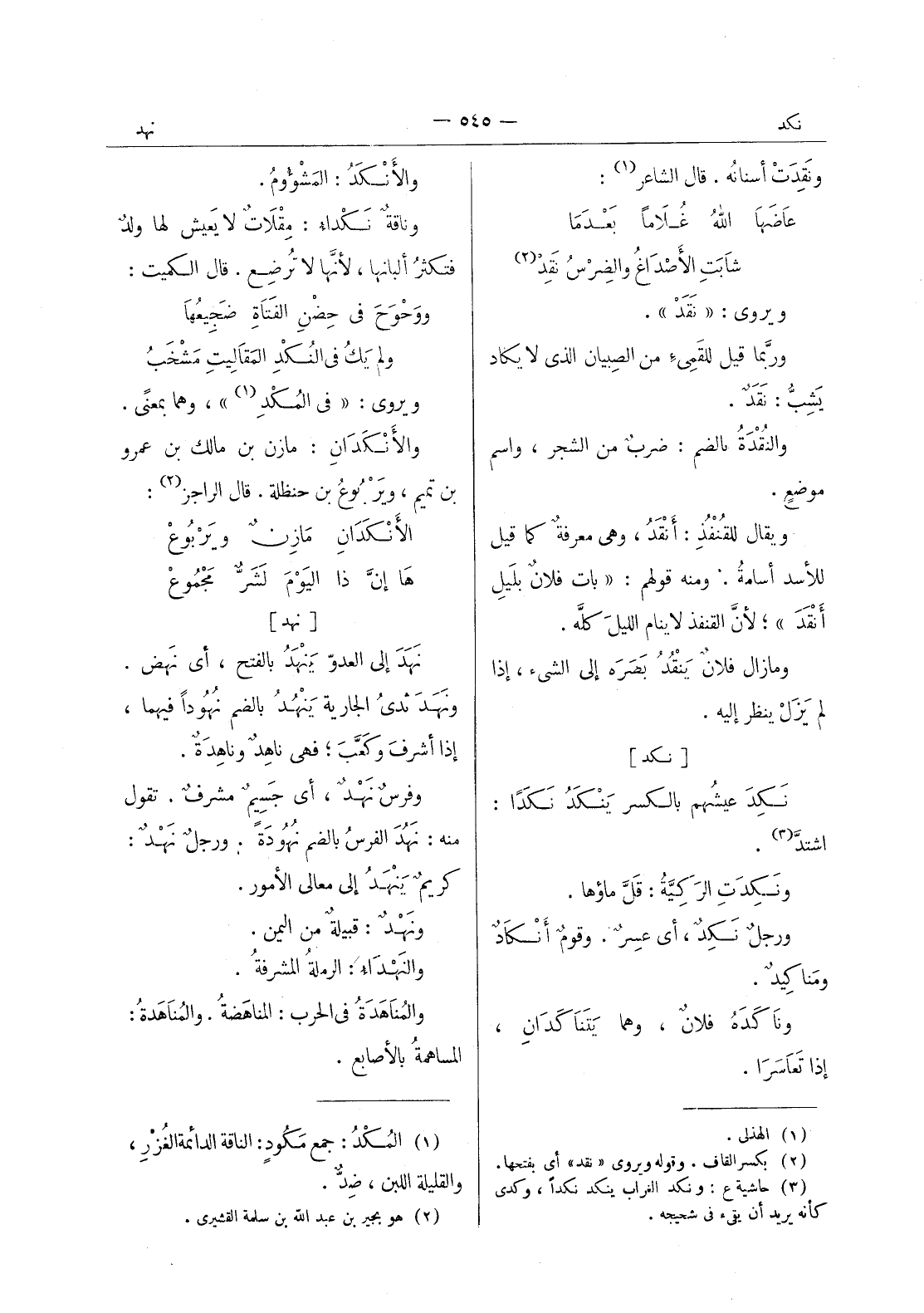 والانكد: المشؤوم. وناقة نكداء: مقلات لا يعيش لها ولد فتكثرة ألبانها، لانها لا ترضع. قال الكميت: ووحوح في حِضْنِ الفتاة ضَجيعُها * ولم يَكُ في النكد المقاليت مشخب - ويروى: " في المكد (¬1) "، وهما بمعنى. والانكدان: مازن بن مالك بن عمرو بن تميم، ويربوع بن حنظلة. قال الراجز (¬2) : الانكدان مازن ويربوع * ها إن ذا اليوم لشر مجموع -