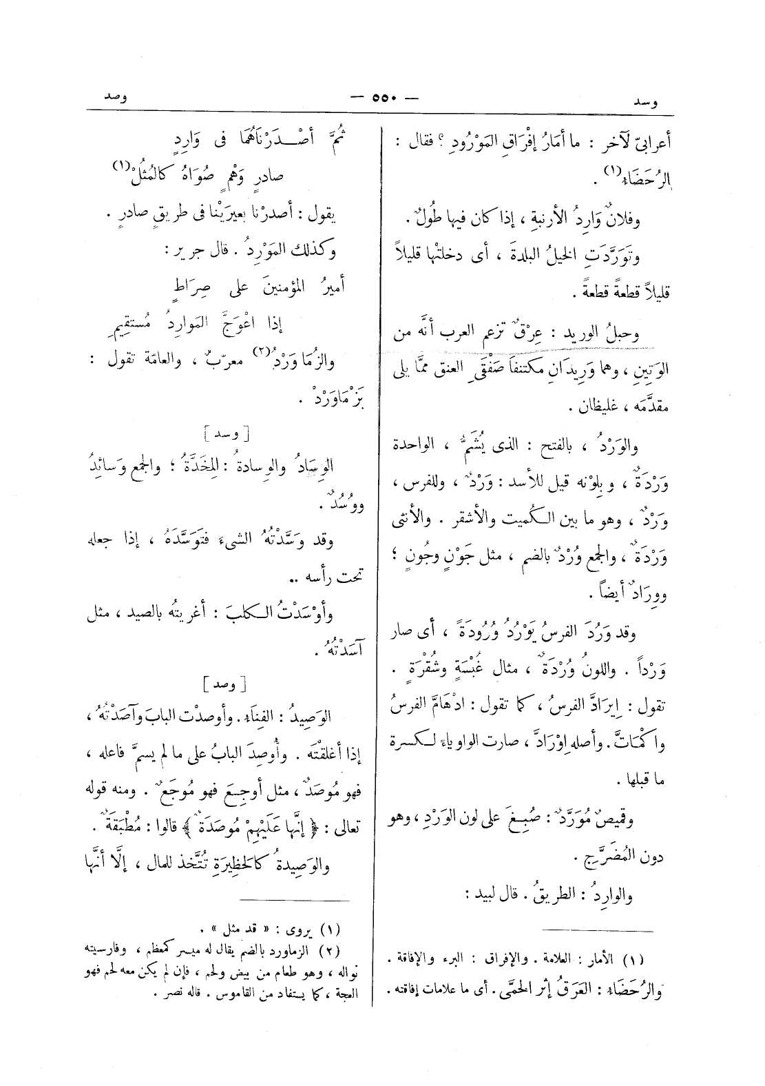 أعرابي لآخر: ما أمار إفراق المورود؟ فقال: الرحضاء (¬1) . وفلان وارد الارنبة، إذا كان فيها طولٌ. وتَوَرَّدَتِ الخيلُ البلدةَ، أي دخلتْها قليلاً قليلاً قطعةً قطعةً. وحبلُ الوريد: عِرْقٌ تزعم العرب أنَّه من الوَتينِ، وهما وَرِيدانِ مكتنفا صَفْقَي العنق ممَّا يلي مقدَّمَه، غليظان. والوَرْدُ، بالفتح: الذي يُشَمُّ، الواحدة وَرْدَةٌ، وبلونه قيل للأسد: وَرْدٌ: وللفرس، وَرْدٌ، وهو ما بين الكُميت والأشقر. والأنثى وَرْدَةٌ، والجمع ورد بالضم، مثل جون وجون، ووراد أيضا. وقد ورد الفرس يورد وردة، أي صار وردا. واللون وردة، مثلا غُبْسَةٍ وشُقْرَةٍ. تقول: اِيرادَّ الفرسُ، كما تقول: ادْهامَّ الفرسُ واكْماتَّ. وأصله اِوْرادَّ، صارت الواو ياءً لكسرة ما قبلها. وقميصٌ مُوَرَّدٌ: صُبِغَ على لون الوَرْدِ، وهو دون المُضَرَّجِ. والوارِدُ: الطريقُ. قال لبيد: