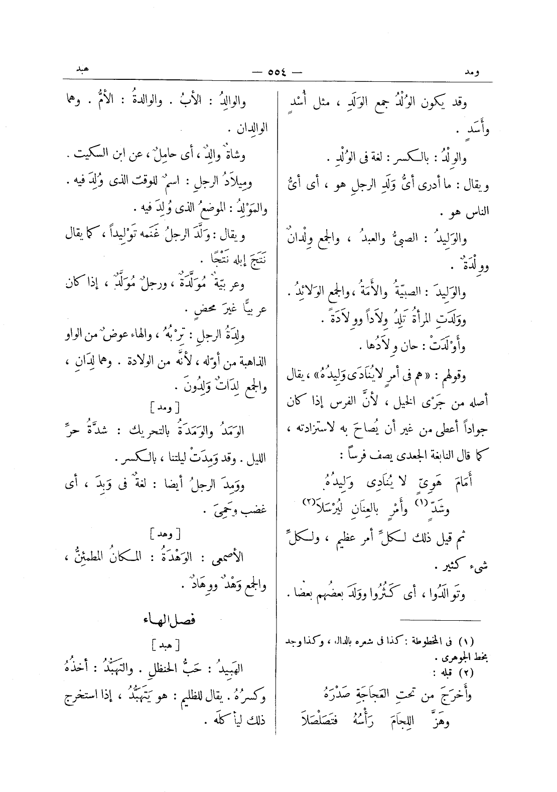 والوالِدُ: الأبُ. والوالِدَةُ: الأمُّ. وهما الوالِدان. وشاةٌ والِدٌ، أي حامِلٌ، عن ابن السكيت. وميلادُ الرجلِ اسمٌ للوقت الذي ولد فيه. والمولد: الموضع الدى وُلِدَ فيه. ويقال: وَلَّدَ الرجلُ غنمه تَوْليداً، كما يقال نَتَجَ إبلهُ نَتْجاً. وعربيَّةٌ موَلَّدَةٌ، ورجلٌ موَلَّدٌ، إذا كان عربيًّا غيرَ محض. ولدة الرجل: تربه، والهاء عوض من الواو الذاهبة من أوله، لانه من الولادة. وهما لدان، والجمع لدات ولدون.