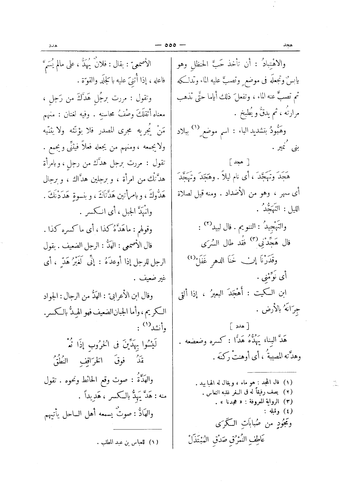 [هجد] هَجَدَ وتَهَجَّدَ، أي نام ليلاً. وهَجَدَ وتَهَجَّدَ أي سهر، وهو من الأضداد. ومنه قيل لصلاة الليل: التَهَجُّدُ. والتَهْجيدُ: التنويم. قال لبيد (¬2) : قال هَجِّدْني (¬3) فقد طال السُرى * وقَدَرْنا إنْ خَنا الدهر غفل (¬4) - أي نومنى. ابن السكيت: أهجد البعيرُ، إذا ألقى جِرانَهُ بالأرض.