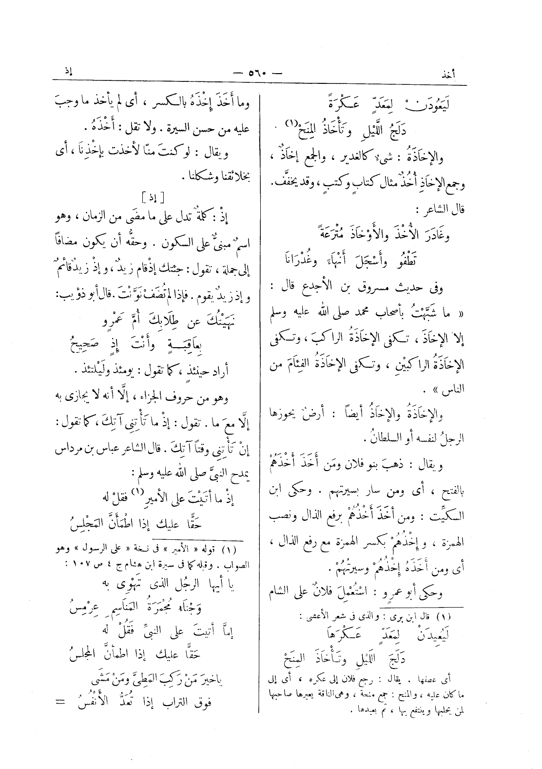 [إذ] إذ: كملة تدل على ما مضَى من الزمان، وهو اسمٌ مبنيُّ على السكون. وحقُّه أن يكون مضافاً إلى جملة، تقول: جئتك إذْ قام زيدٌ، وإذْ زيد قائم وإذ زيدٌ يقوم. فإذا لم تضَفْ نَوَّنْتَ. قال أبو ذؤيب: نَهَيْتُكَ عن طِلابِكَ أمَُّ عَمْرو * بِعاقِبَةٍ وأَنْتَ إذٍ صَحِيحُ - أراد حينئذٍ، كما تقول: يومئذ ولَيْلتئذ. وهو من حروف الجزاء: إلاَّ أنه لا يجازى به إلاَّ معَ ما. تقول: إذا ما تأتني آتك، كما تقول: إنْ تَأْتِني وقتاً آتك. قال الشاعر عباس بن مرداس يمدح النبي صلى الله عليه وسلم: إذ ما أتيت على الامير (¬1) فقل له * حقا عليك إذا اطمأن المجلس -