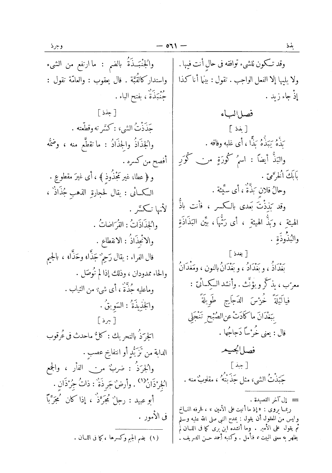[بذذ] بذه يبذه بذا، أي غلبه وفاقه. والبذ أيضا: اسم كورة من كور بابك الخرمى. وحال فلان بذة، أي سيِّئةٌ. وقد بَذِذْتَ بَعدي بالكسر، فأنت باذ لهيئة، وبذ الهيئةِ، أي رَثُّها، بيِّن البّذاذَةِ البذوذة.