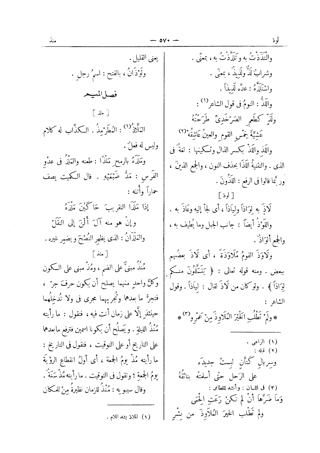 [ملذ] الملاذ (¬1) : المطرمذ. الكلاب له كلام وليس له فعلٌ. ومَلَذَهُ بالرمحِ مَلْذاً: طعنه والمَلْذُ في عدو الفرس: مد ضبعيه. قال الكميت يصف حمارا وأتنه: إذا ملذا التقريب حاكين ملذه * وإن هو منه آل ألن إلى النقل - والملذان: الذي يظهِر النُصْحَ ويضمِر غيره.