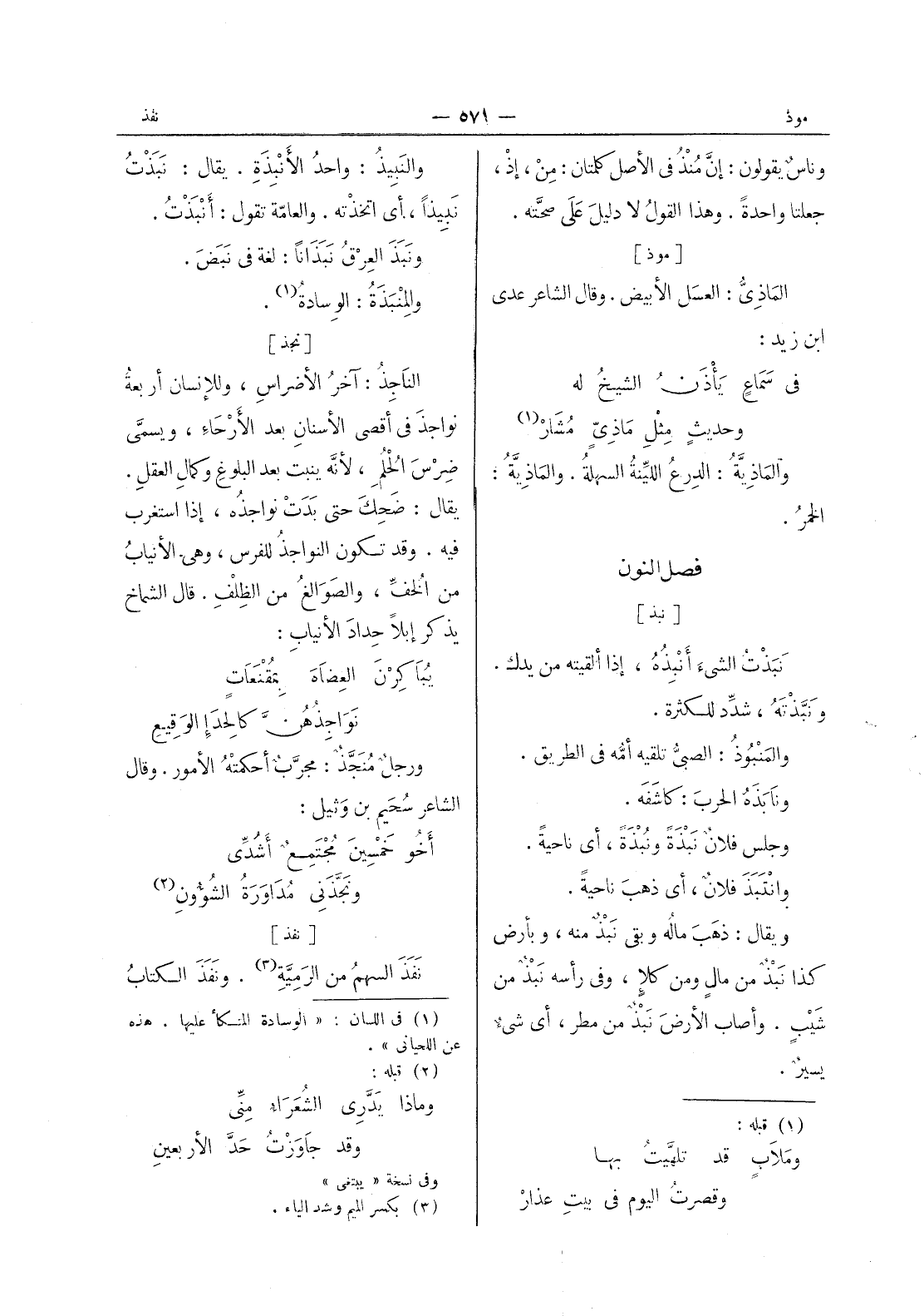 [نجذ] الناجِذُ: آخرُ الأضراسِ، وللإنسان أربعة نواجذَ في أقصى الأسنانِ بعد الارحاء، ويسمَّى ضِرْسَ الحُلُمِ، لأنه ينبت بعد البلوغ وكمال العقل. يقال: ضَحِكَ حتَّى بَدَتْ نواجذُه، إذا استغرب فيه. وقد تكون النواجذ للفرس، وهى الانياب من الخف، والصوالغ من الظلف. قال الشماخ يذكر إبلا حداد الانياب: يباكرن العضاه بمقنعات * نواجذهن كالحداء الوقيع - ورجل منجذ: مجرَّبٌ أحكمتهُ الأمور. وقال الشاعر سحيم بن وثيل: أخو خَمسينَ مُجْتَمعٌ أشدِّي - ونَجَّذَني مُداوَرَةُ الشُؤونِ (¬2) -
