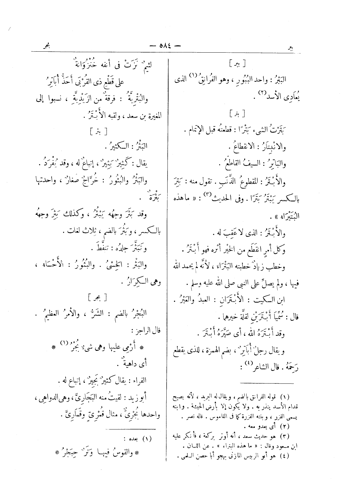 لئيمٌ نَزَتْ في أنفِه خُنْزُوانَةٌ * على قطع ذى القربى أحذ أباتر - والبترية: فرقة من الزيدية، نسبوا إلى المغيرة بن سعد، ولقبه الابتر.