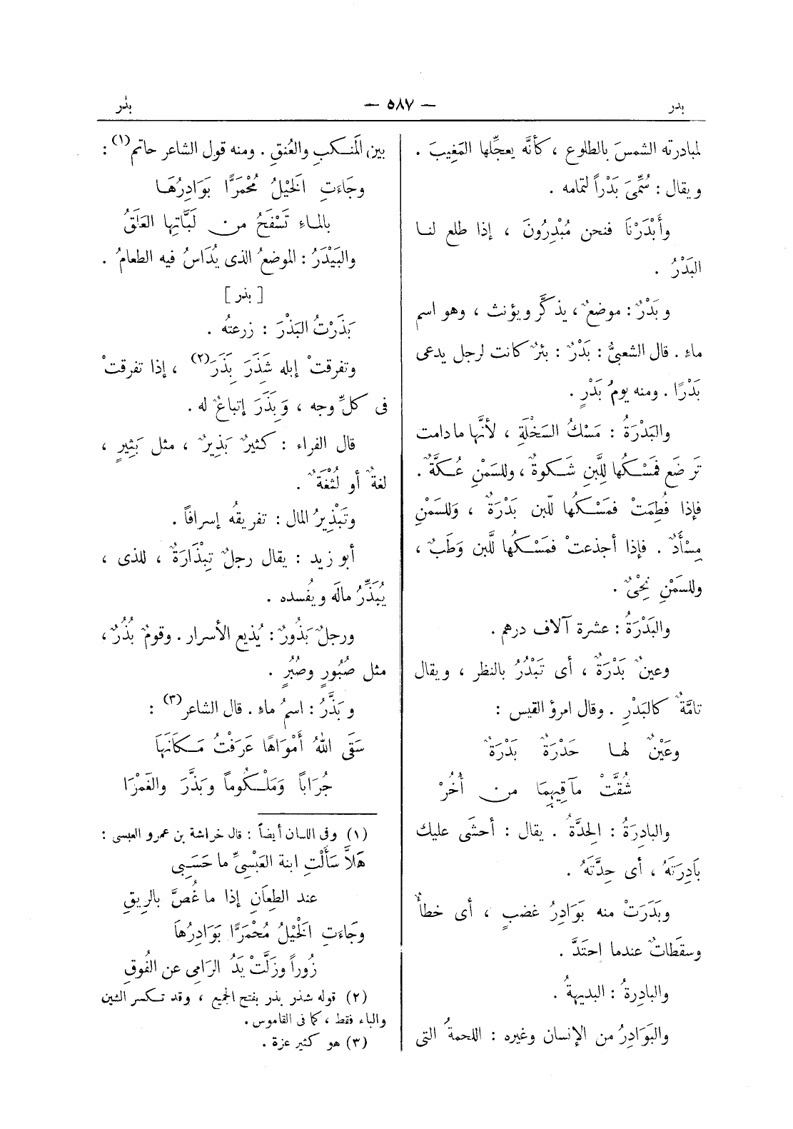 لمبادرته الشمس بالطلوع، كأنه يعجِّلها المَغِيبَ. ويقال: سُمِّيَ بَدْراً لتمامه. وأَبْدَرْنا فنحن مُبْدِرونَ، إذا طلع لنا البدر. وبدر: موضع، يذكر ويؤنث، وهو اسم ماء. قال الشعبى: بدر: بئر كانت لرجل يدعى بدرا. ومنه يوم بدر. والبدرة: مسك السخلة، لانها مادامت ترضع فَمسْكُها للّبن شكوة، وللسمن عكة. فإذا فطمت فمسكها للبن بدرة، وللسمن مسأد. فإذا أجذعت فمسكها للبن وطب، وللسمن نحى. والبدرة: عشرة الآف درهم. وعينٌ بَدْرَةٌ، أي تَبْدُرُ بالنظر، ويقال تامَّةٌ كالبَدْرِ. وقال امرؤ القيس: وعَيْنٌ لها حَدْرَةٌ بَدْرَةٌ * شُقَّتْ مآقيهِما من أُخُرْ - والبادرة: الحدة. يقال: أحشى عليك بادِرَتَهُ، أي حدَّتَهُ. وبَدَرَتْ منه بوادر غضب، أي خطأ وسقطات عندما احتَدَّ. والبادِرَةُ: البديهةُ. والبَوادِرُ من الإنسان وغيره: اللحمةُ التي