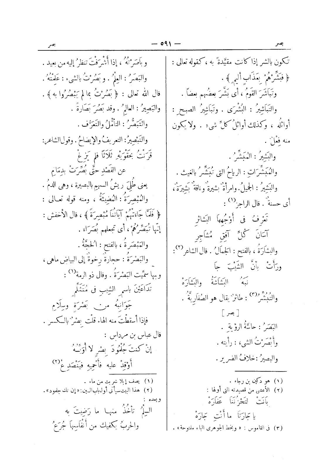 (بَصُرْتُ بما لم يَبْصُروا به) *. والبَصيرُ: العالِمُ. وقد بَصُرَ بَصارةً. والتَبَصُّرُ: التأمُّلُ والتَعَرُّف. والتَبْصيرُ: التعريفُ والايضاح. وقول الشاعر: قرنت بحَقْوَيْهِ ثلاثاً فلم يَزُغْ * عن القصد حتى بصرت بدمام - يعنى طلى ريش السهم بالبصيرة، وهى الدم. والمبصرة: المضيئة، ومنه قوله تعالى: