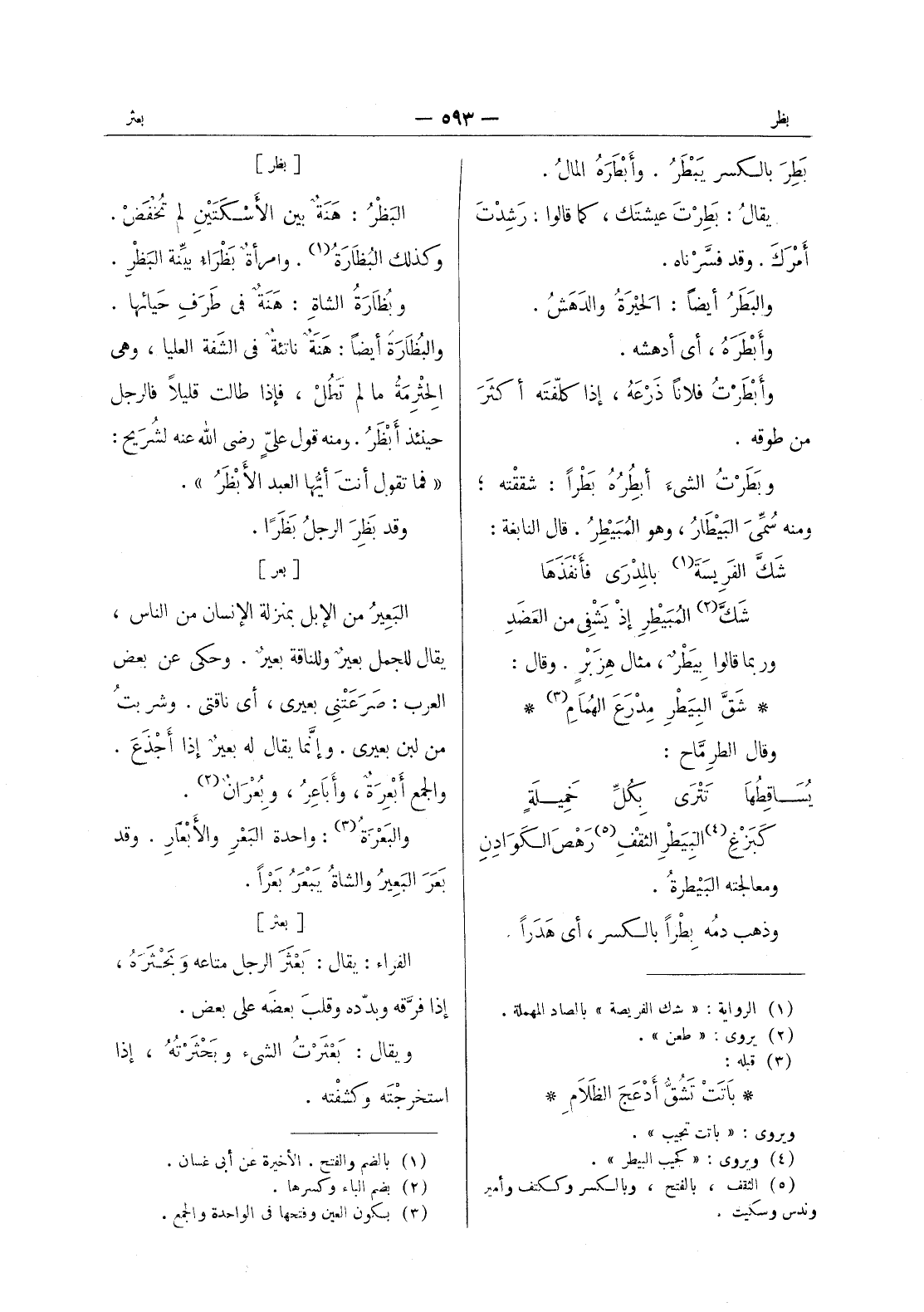 بطر بالسكر يبطر. وأَبْطَرَهُ المالُ. يقال: بَطِرْتَ عيشتَك، كما قالوا: رشدت أمرك. وقد فسرناه. والبطر أيضاً: الحَيْرَةُ والدَهَشُ. وأَبْطَرَهُ، أي أدهشه. وأَبْطَرْتُ فلاناً ذَرْعَهُ، إذا كلّفتَه أكثَرَ من طوقه. وبَطَرْتُ الشئ أبطره بطرا: شققته، ومنه سمى البيطار وهو المبيطر. قال النابغة: شك الفريسة (¬1) بالمدرى فأَنْفَذَها * شَكَّ (¬2) المبَيْطِرِ إذ يَشْفي من العضد - وربما قالوا يبطر، مثال هزبر. وقال: