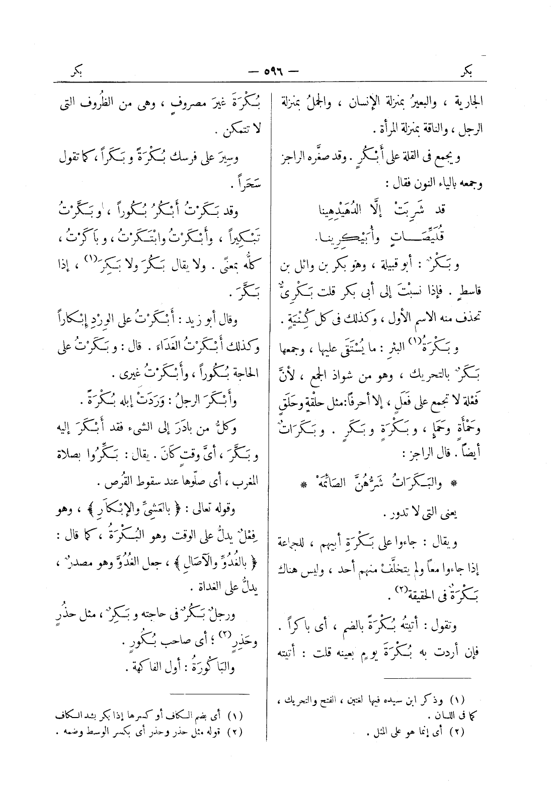 بكرة غيرَ مصروفٍ، وهي من الظُروف التي لا تتمكن. وسِيرَ على فرسك بُكْرَةً وبَكَراً، كما تقول سَحَراً. وقد بَكَرْتُ أَبْكُرُ بُكوراً، وبَكَّرْتُ تَبْكِيراً، وأَبْكَرْتُ وابْتَكَرْتُ، وباكَرْتُ كله بمعنى. ولا يقال بكر ولا بكر (¬1) ، إذا بكر. وقال أبو زيد: أَبْكَرْتُ على الوِرْدِ إِبْكاراً وكذلك أَبْكَرْتُ الغَداءَ. قال: وبَكَرْتُ على الحاجة بكورا، وأبكرت غيرى. وأبكر الرجلُ: وَرَدَتْ إِبله بُكْرَةً. وكلُّ من بادر إلى الشئ فقد أَبْكَرَ إليه وبَكَّرَ، أيَّ وقتٍ كانَ. يقال: بَكِّرُوا بصلاة المغرب، أي صلّوها عند سقوط القُرص. وقوله تعالى: