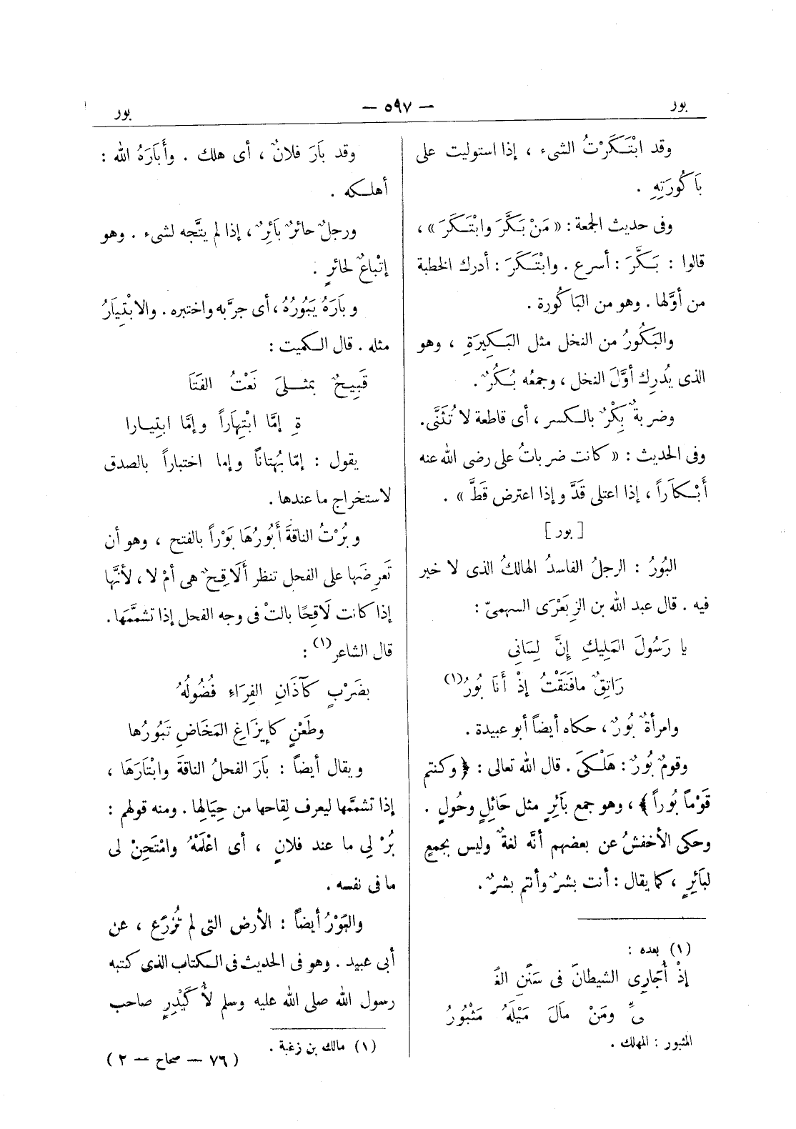 وقد بار فلان، أي هلك. وأبارَهُ الله: أهلكه. ورجلٌ حائرٌ بائِرٌ، إذا لم يتجه لشئ. وهو إتباع لحائر. وبارَهُ يَبورُهُ، أي جرَّبه واختبره. والابْتيارُ مثله. قال الكميت: قَبيحٌ بمثليَ نَعْتُ الفَتا * ةِ إِمَّا ابتهار أو إما ابتيارا - يقول: إما بهتانا وإما اختبار بالصدق لاستخراج ما عندها. وبَرْتُ الناقةَ أَبورُهَا بَوراً بالفتح، وهو أن تَعرِضَها على الفحل تنظر ألا قح هي أمْ لا، لأنَّها إذا كانت لاقِحاً بالتْ في وجه الفحل إذا تشممها. قال الشاعر (¬1) : بضرب كآذان الفراء فضوله * وطعن كإيزاغ المخاض تبورها - ويقال أيضا: بار الفحلُ الناقةَ وابْتارَها، إذا تشمَّمها ليعرف لِقاحها من حِيالِها. ومنه قولهم: بُرْ لي ما عند فلانٍ، أي اعْلَمْهُ وامْتَحِنْ لي ما في نفسه. والبور أيضا: الارض التى لم تزرع، عن أبى عبيد. وهو في الحديث في الكتاب الذى كتبه رسول الله صلى الله عليه وسلم لاكيدر صاحب