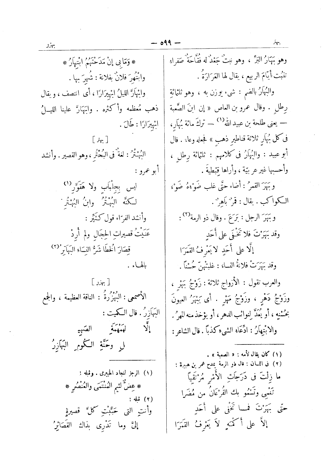 وهو بهار البر، وهو نبت جعد له فقاحة صفراء تنبت أيام الربيع، يقال لها العرارة. والبهار بالضم: شئ يوزن به، وهو ثلثمائة رطل. وقال عمر وبن العاص " إن ابن الصعبة - يعنى طلحة بن عبيد الله (¬1) - ترك مائة بهار، في كل بهار ثلاثة قناطير ذهب " فجعله وعاء. قال أبو عبيد: والبهار في كلامهم: ثلثمائة رطل، وأحسبها غير عربية، وأراها قبطية. وبهر القمر: أضاء حتى غلب ضَوْءَهُ ضَوْءَ الكواكب. يقال: قمرٌ باهِرٌ. وبَهَرَ الرجل: بَرَعَ. وقال ذو الرمة (¬2) : وقد بَهَرْتَ فلا تَخْفى على أحَدٍ * إلاَّ على أَحَدٍ لا يَعْرِفُ القَمَرا - وقد بهرت فلانة السناء: غلبتهن حسنا. والعرب تقول: الازواج ثلاثة: زوج بهر، وزوج دهر، وزوج مهر. أي يبهر العيون بحسنه، وأو يعد لنوائب الدهر، أو يؤخذ منه المهر. والابتهار: ادعاء الشئ كذبا. قال الشاعر: