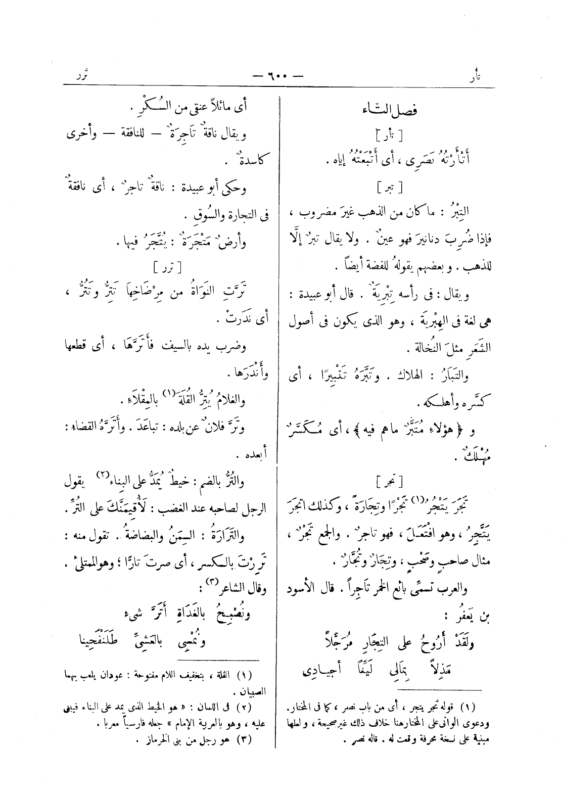 [تجر] تَجَرَ يَتْجُرُ (¬1) تَجْراً وتِجارَةً، وكذلك اتجر يتجر، هو افتعل، فهو تاجر. والجمع تجر، مثال صاحب وصحب، وتجار وتجار. والعرب تسمى بائع الخمر تاجرا. قال الاسود بن يعفر: ولقد أروح على التجار مرجلا * مذلا بمالى ليغا أجيادى -